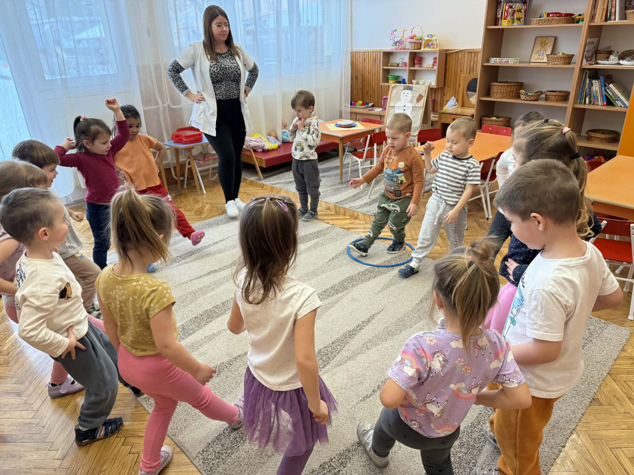 A Katica csoportban a gyerekekkel a vezetői képességeket gyakoroltuk. A vezető képességgel rendelkező gyermekek szívesen jelentkeztek a feladatra. A ,,Ritmusosan” nevű játékot játszottuk el. A gyermekek közül választottunk egy gyereket, aki a karikába állt. Itt neki mutatnia kellett a tánc mozdulatait, valamint ő mutatta meg, hogy milyen ritmust üssenek, tapsoljanak a többiek. A gyermekek nagyon ügyesen helyt álltak a feladatok során. Hamar kiderült, kik azok, akik bátran és sikeresen vezetik a többieket.