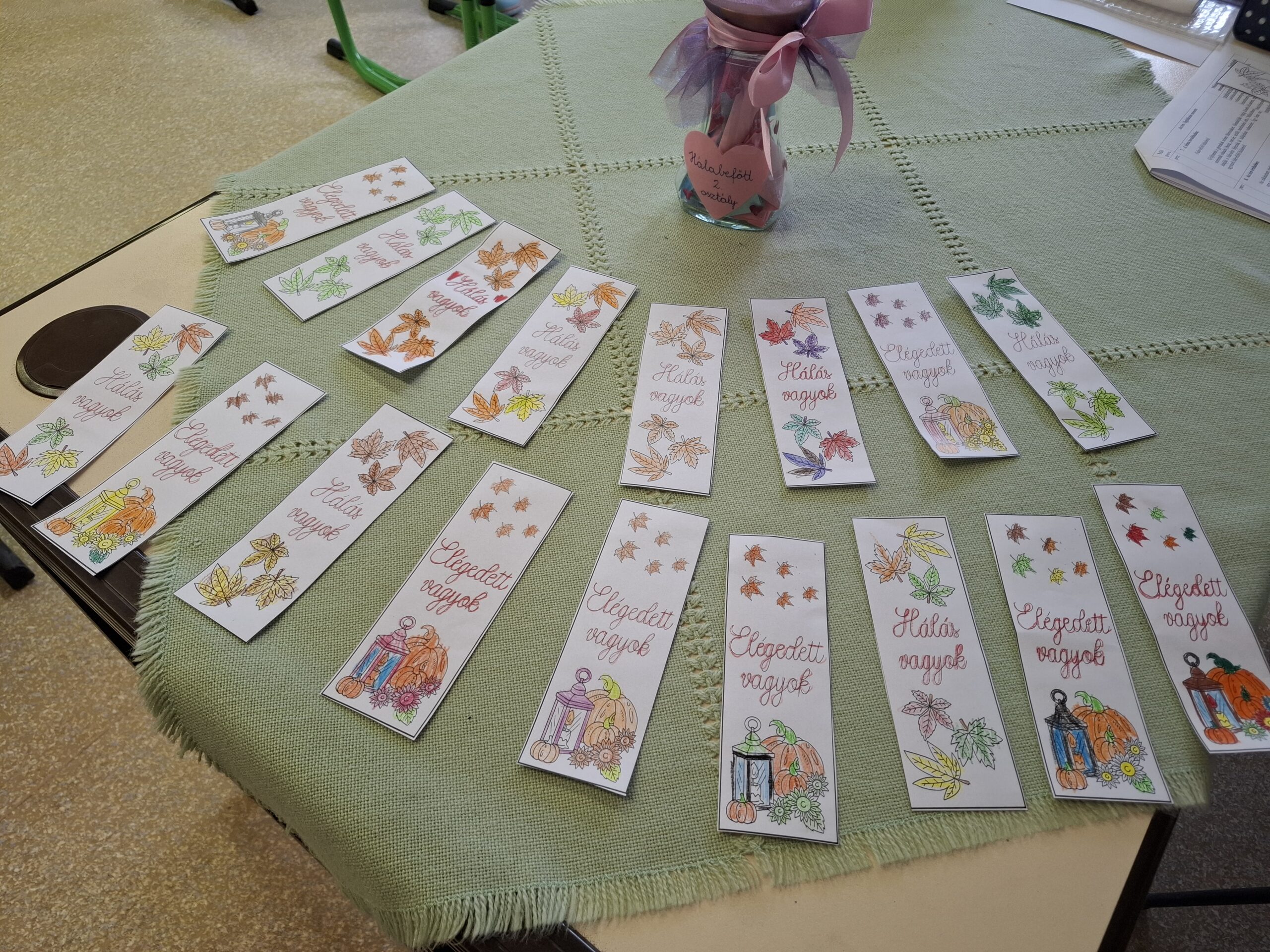 A mai foglalkozáson A hála témakörét mesével dolgoztuk fel. Készítettünk a meséhez rajzokat, színeztünk hálafát. Elkészítettük az osztály hálabefőttjét és szép őszi hálakönyvjelzőket is. A foglalkozást relaxációs gyakorlattal, mozgásos játékkal, és zenehallgatással tettük színesebbé.