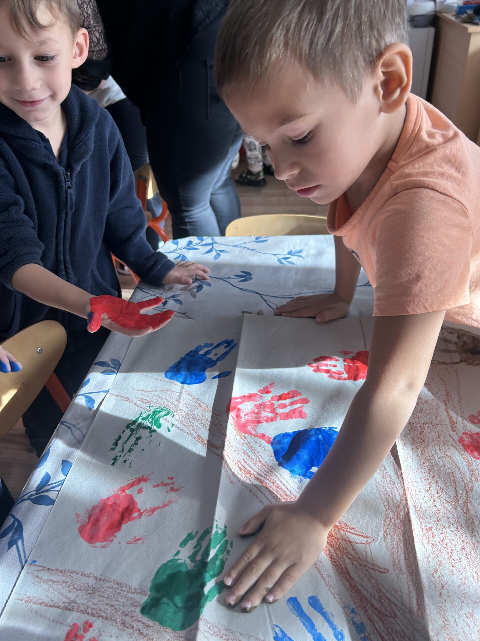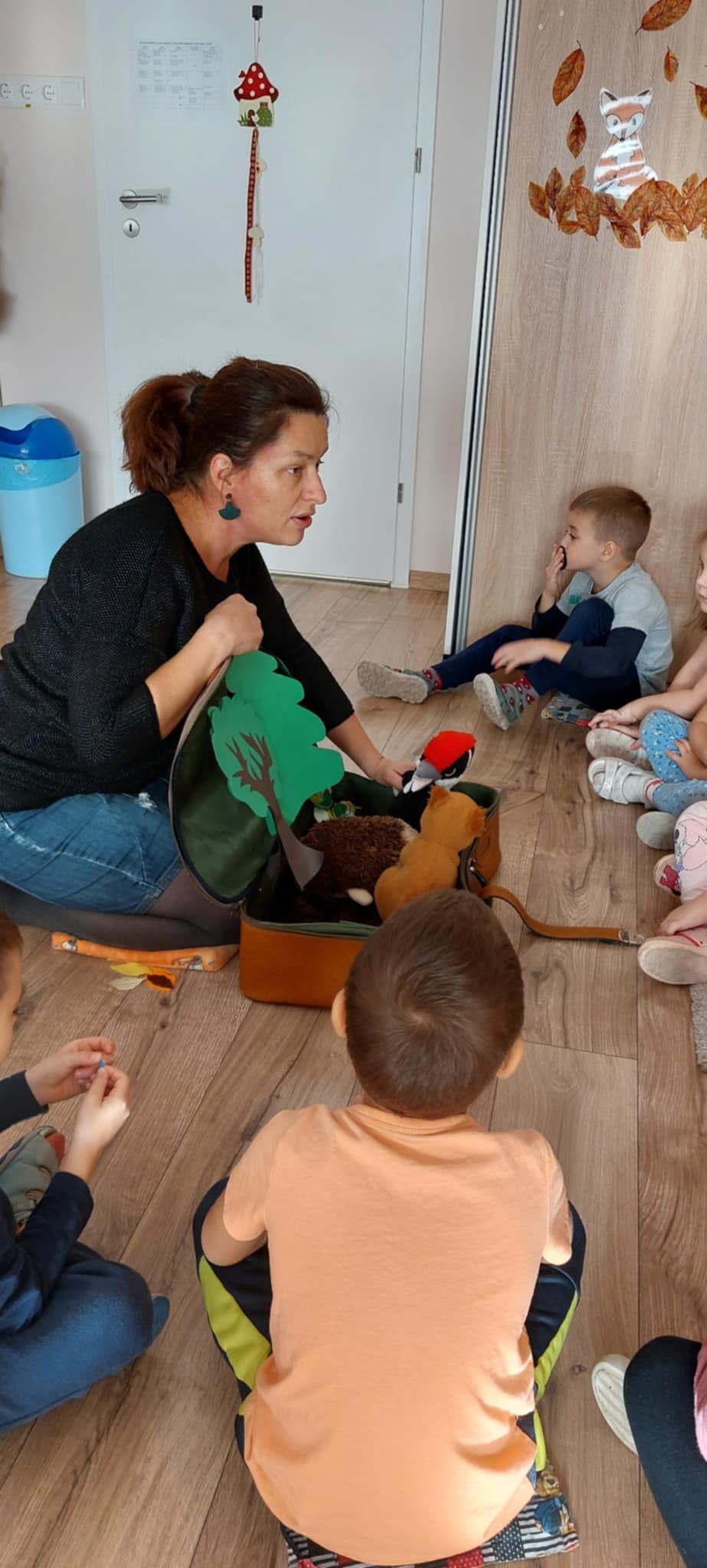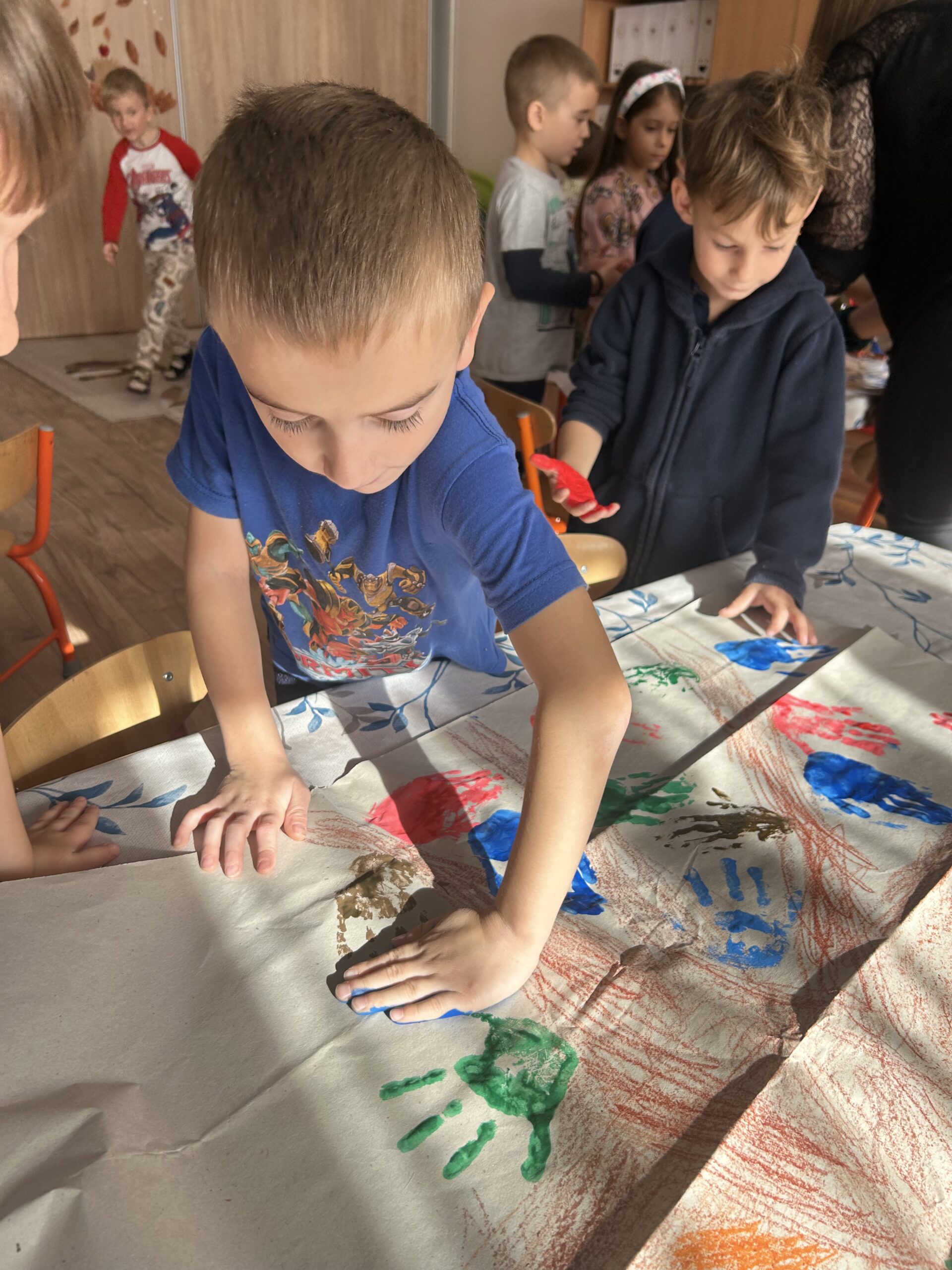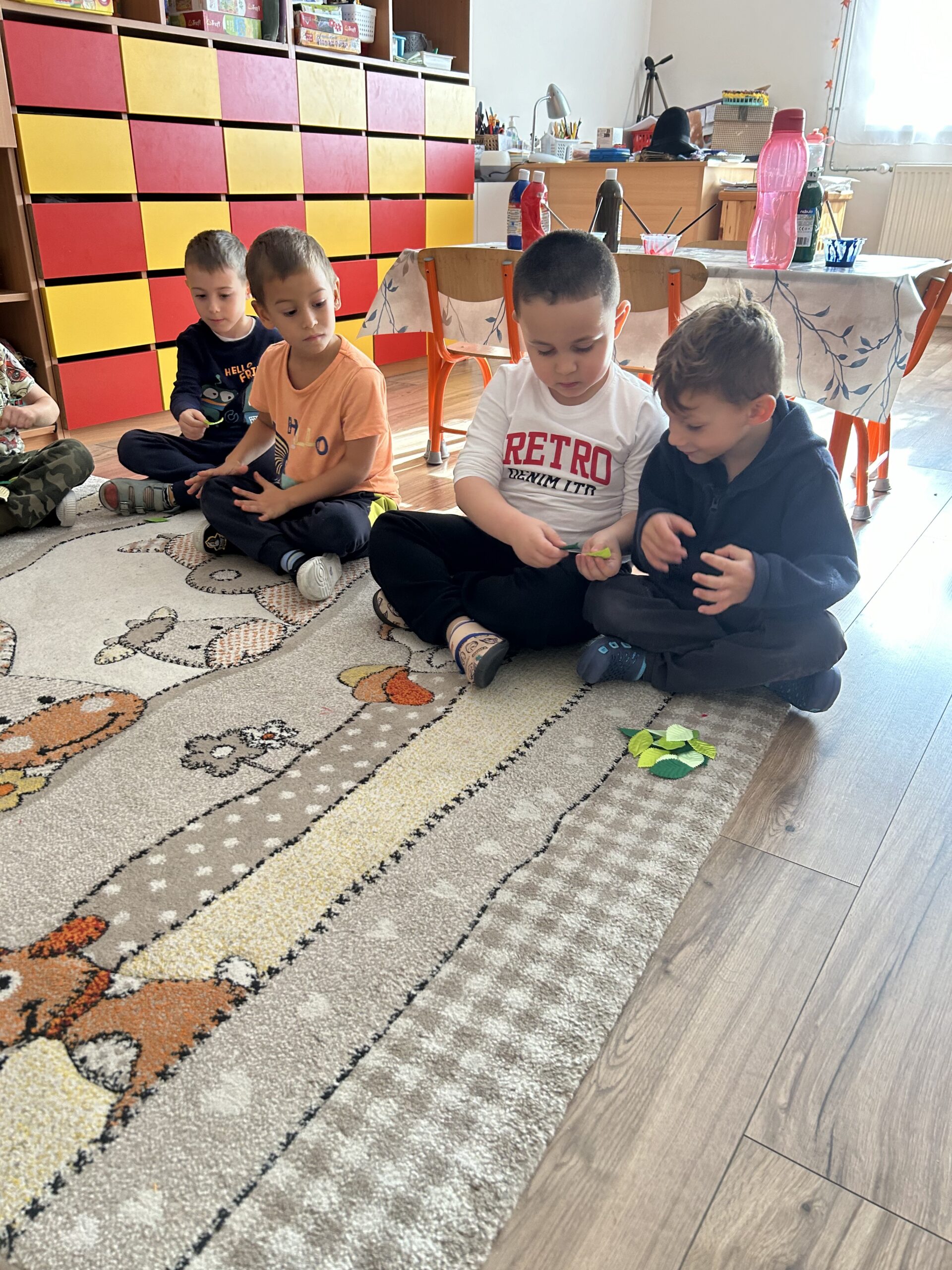 A hála témakörrel foglalkoztunk szeptemberben, a foglalkozást az Add tovább a falevelet c. játékkal vezettem be, ezzel segítve az elcsendesedėst, az egymásra való odafigyelést. Majd ezután következett a mese. Amikor a mesebőrönd előkerül, már minden gyermek tudja, hogy mesét fognak hallani, ilyenkor előkerülnek a mesepárnák és egymás mellé leülve várják, hogy elkezdődjék a foglalkozás. A hálafa történetét meséltem el a gyerekeknek, amelyet csendben és koncentráltan figyeltek, a bevezető, ráhangolódást segítő játéknak köszönhetően. Nagy hatást gyakorolt rájuk, amit mi sem bizonyít jobban, mint hogy kérték, hogy meséljem el még egyszer. Ezen a napon ugyan már nem jutott rá idő a délelőtt folyamán, de alvásidőben és másnap még egyszer meghallgathatták a mesét. A foglalkozást a hálafa megfestésével zártuk le, amihez örömmel csatlakozott minden egyes gyermek.