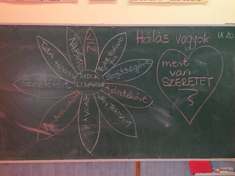 A második foglalkozás nehezebb témának bizonyult (számomra is 🙂 ), a hála fogalmával, jóságával, bennünk rejlőlehetőségeiről beszélgettünk, az óra végén a hálabefőttbe mindenki leírta, hogy miért vagy kinek hálás.