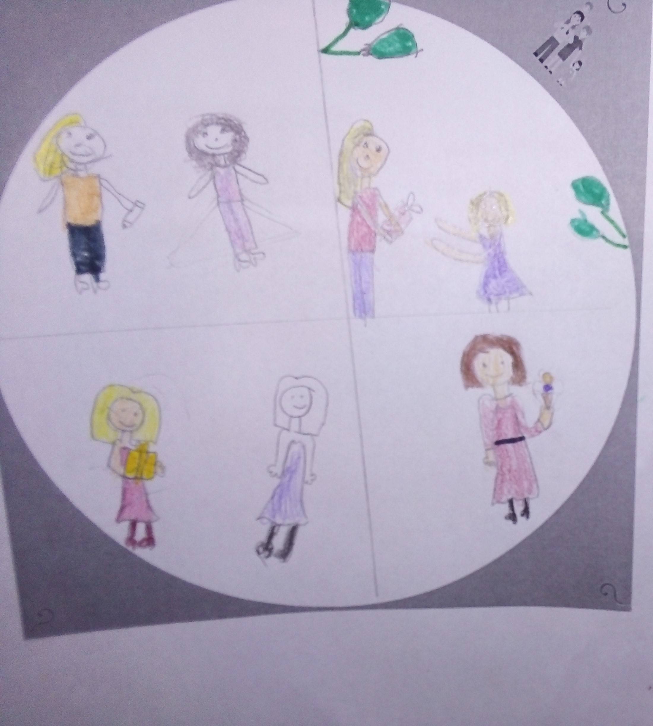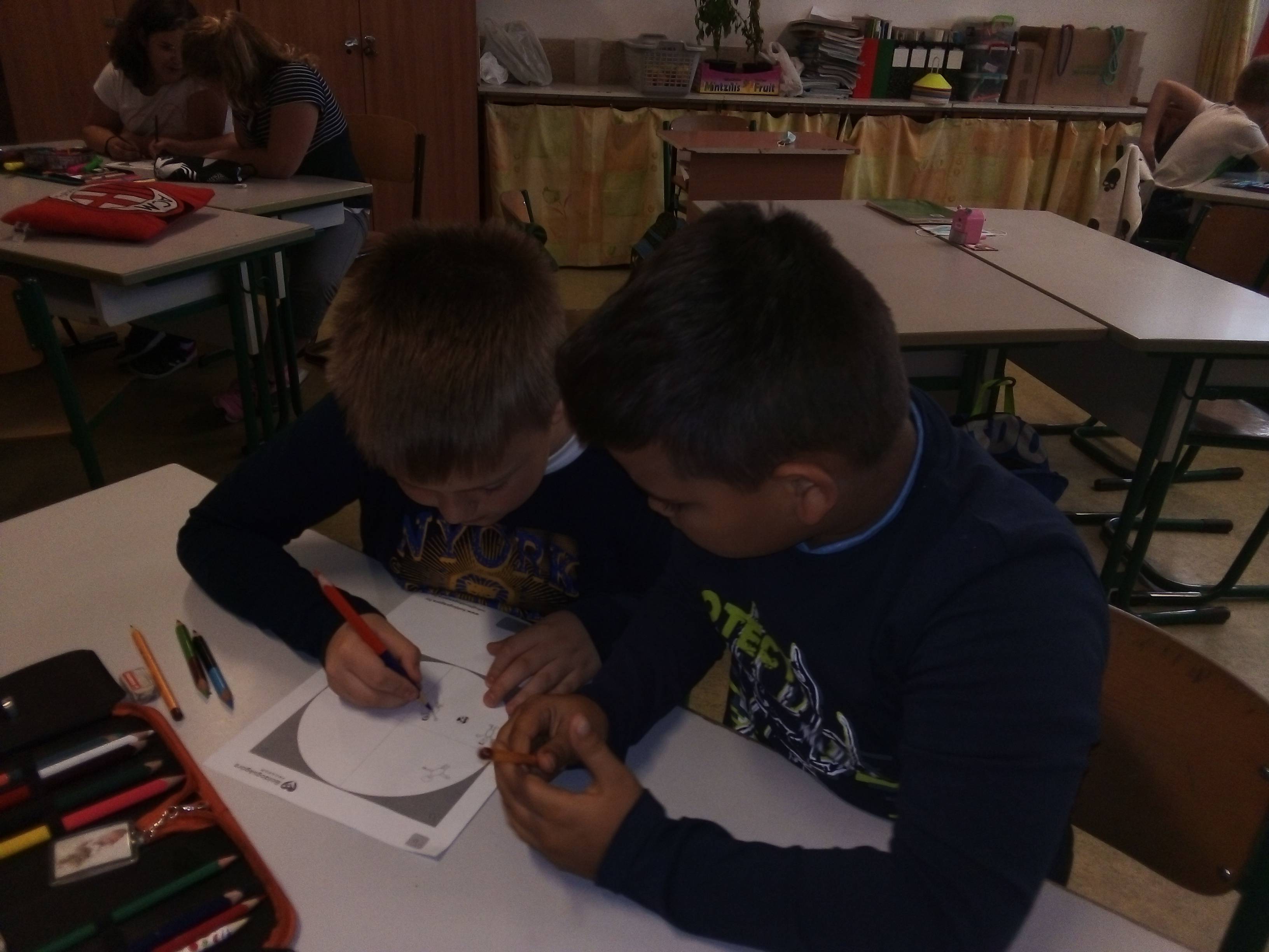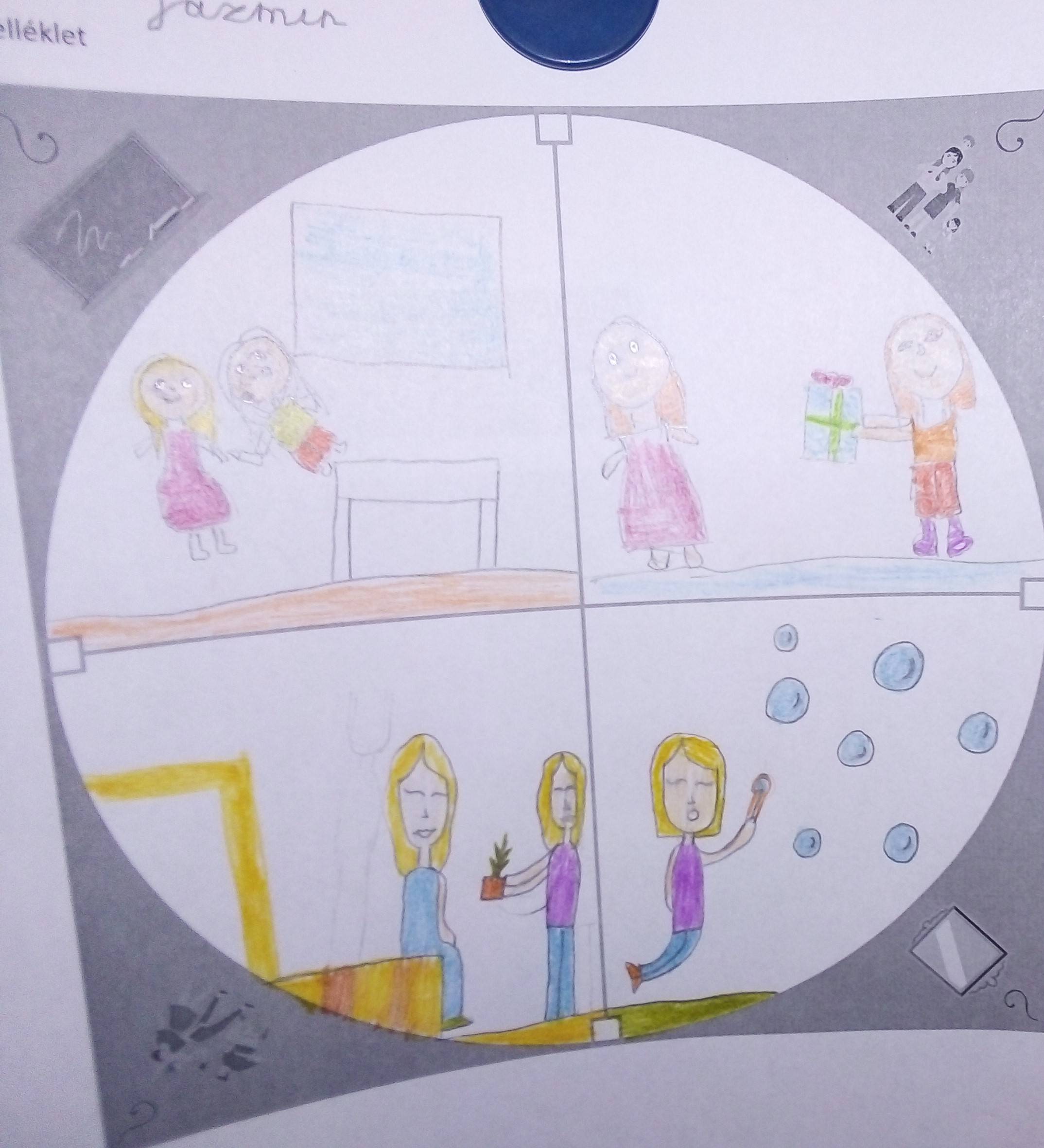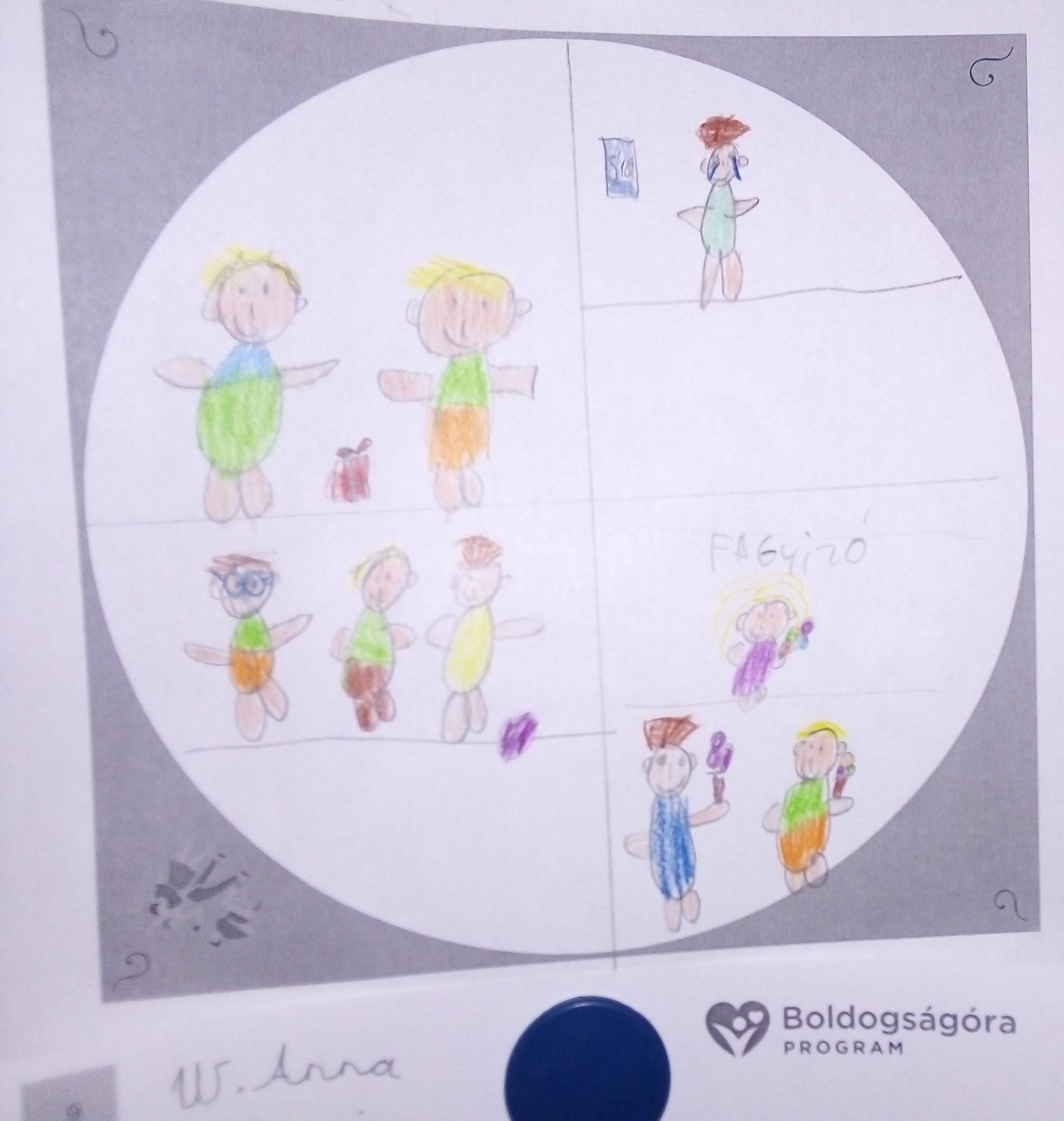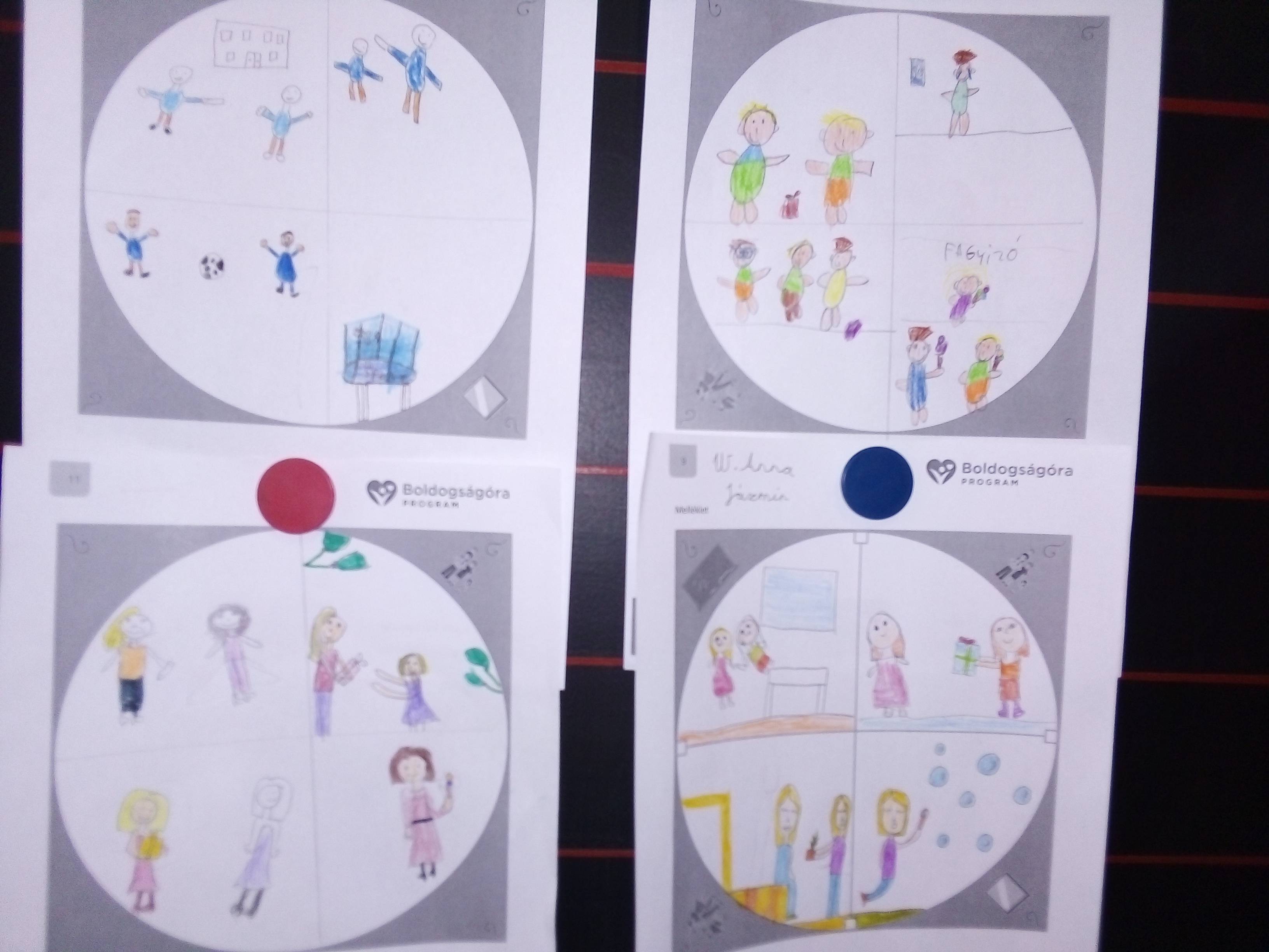 Az óra első felében a „hála” szó jelentéséről beszélgettünk. A gyerekek, példákon keresztül, elmesélték kinek, miért voltak hálásak eddig. Utána csoportonként egy-egy kitalált történetben játszották el, hogyan hálálhatnak meg valamit a mindennapokban. Majd páros munkában a hálakörbe le is rajzolták a velük megtörtént eseményeket. A foglalkozás végén a körjátékban véletlenszerűen egymáshoz került párok fogalmazták meg egymásnak, hogy miért éreznek hálát a másik iránt. Jó hangulatú, vidám boldogságóra keretében tudtuk ezt a témát feldolgozni.