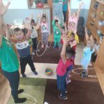 A gyerekekkel közösen énekelünk, közben táncolunk, és a szőnyegen mozgunk a dalra.