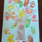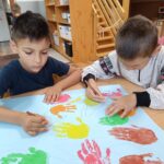 A gyerekekkel leülünk az asztalhoz. Mindenki kap egy papírlapot, melyre a festékkel befestett bal tenyerének (szív felőli oldal) lenyomatát helyezi el.