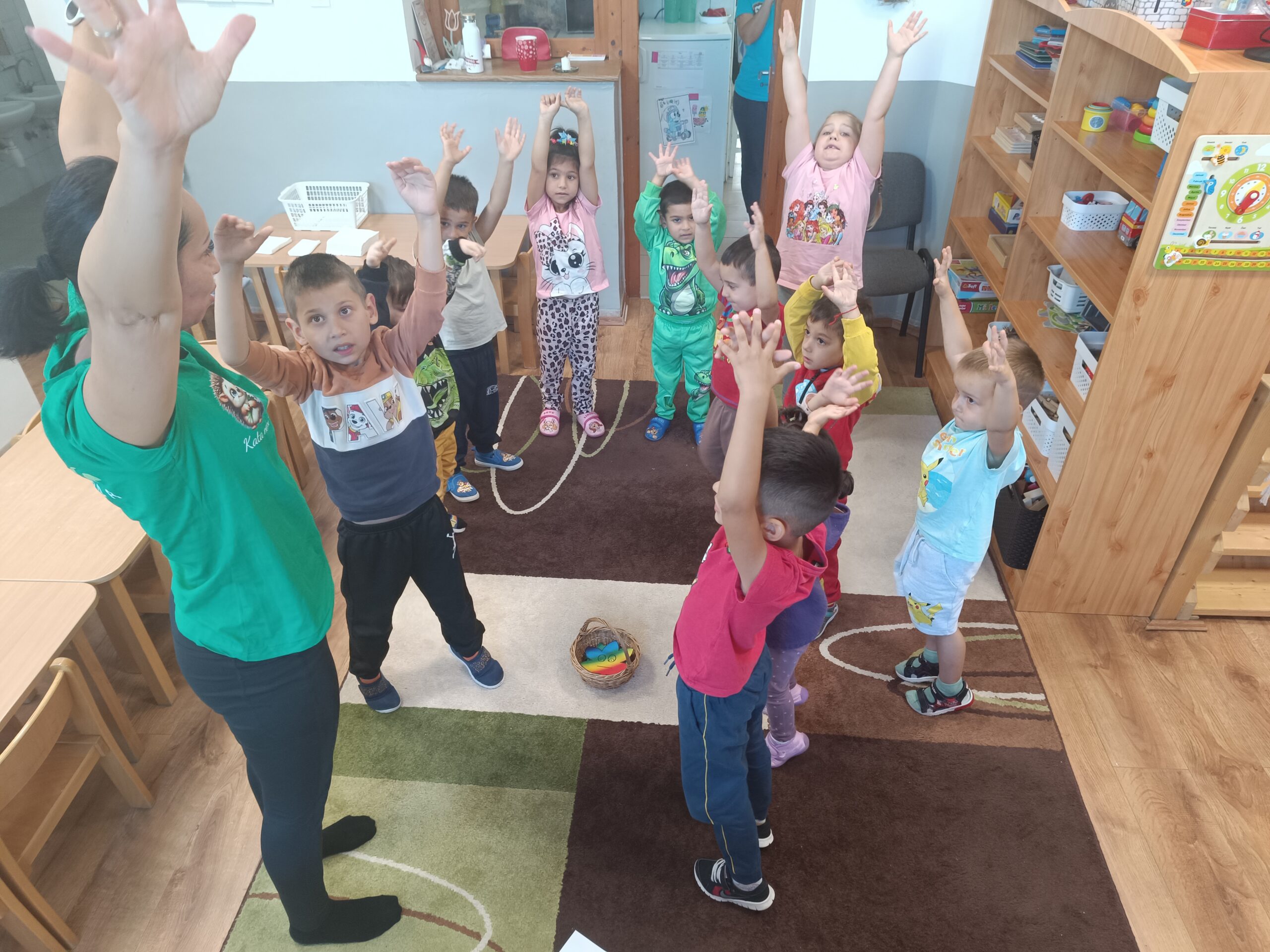 A gyerekekkel közösen énekelünk, közben táncolunk, és a szőnyegen mozgunk a dalra.