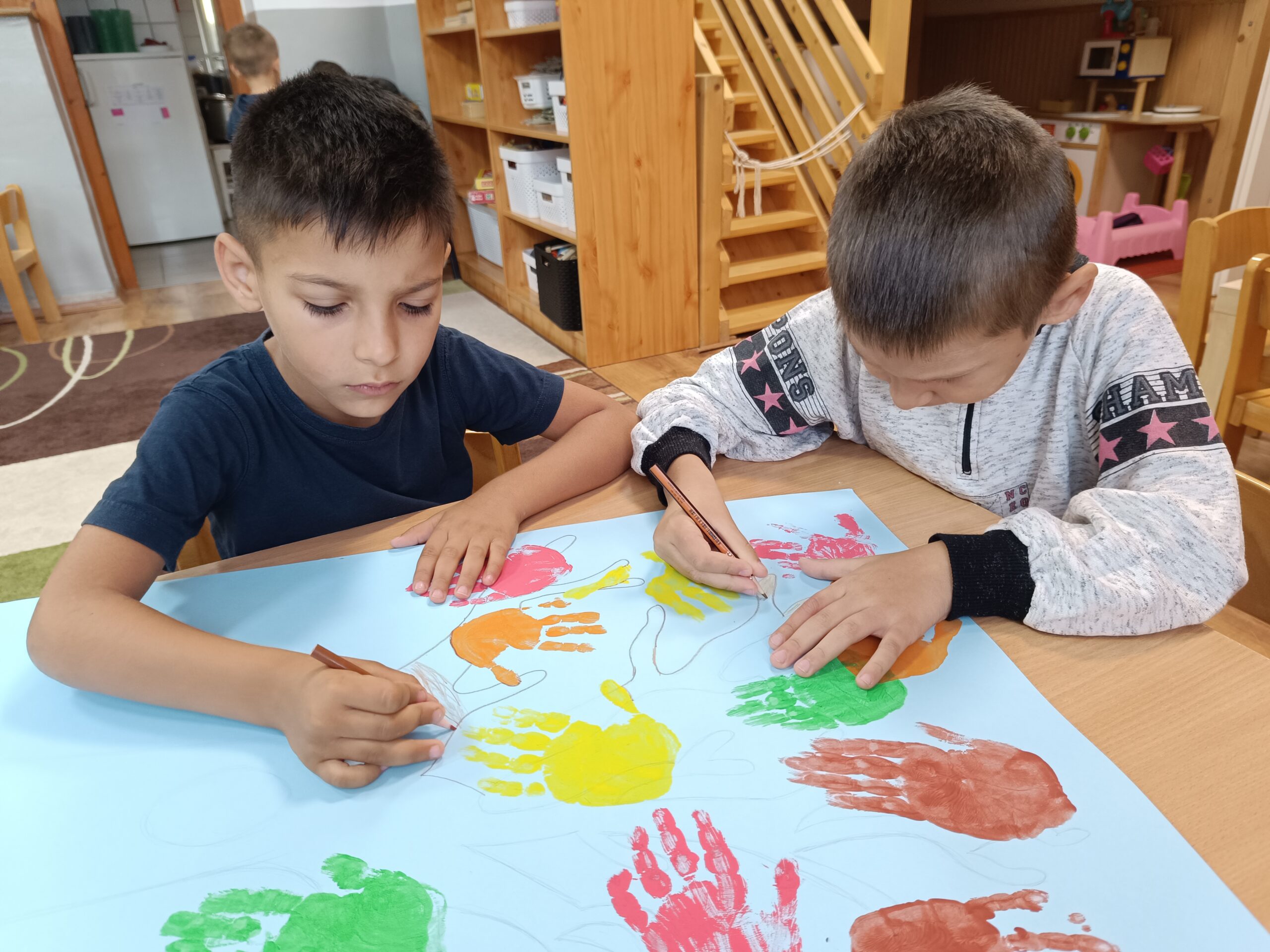 A gyerekekkel leülünk az asztalhoz. Mindenki kap egy papírlapot, melyre a festékkel befestett bal tenyerének (szív felőli oldal) lenyomatát helyezi el.