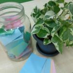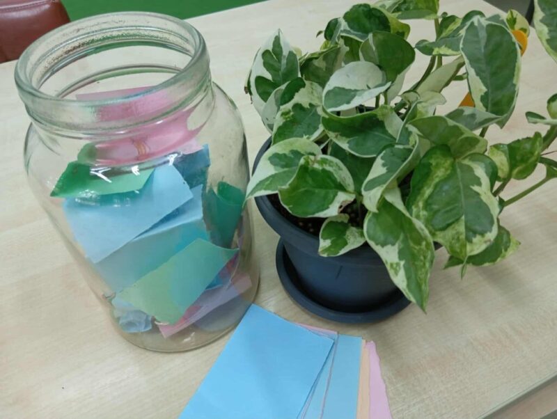 – Hála/szeretet befőtt készítése, pozitív érzelmek, hálás vagyok, valami jó történt velem – cédula. Nem csak az órán, hanem egész szeptemberben bármikor rajzolhattak lapocskákra, akár az osztályban tanítók is, és bedobhatták befőttes üvegbe.