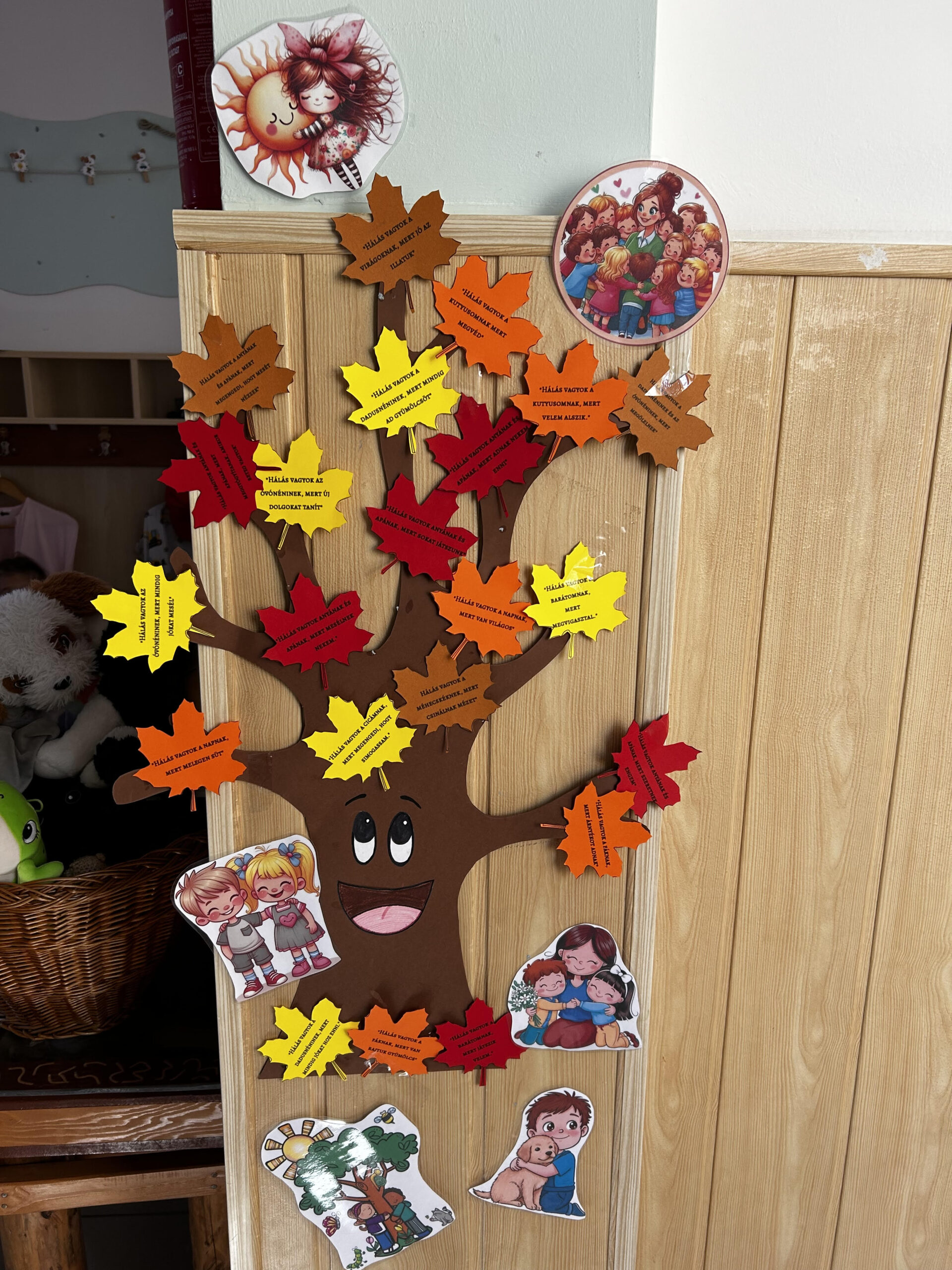 Közös alkotásként elkészítettük a Boldogságfánkat, melynek leveleire ráírtuk a gyerekek által elmondott hála ötleteket és konkrét köszöneteket. A fa így hamar megtelt színes levelekkel, amelyek jól mutatták a gyermekek őszinte érzéseit.