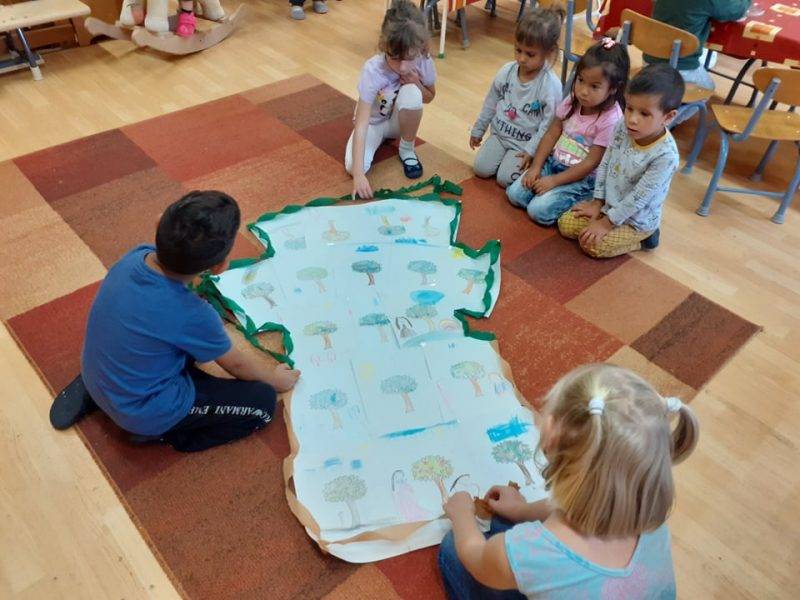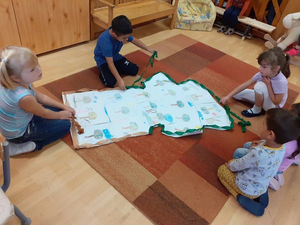 A délelőtti órákban a Boldogságórát megelőzőleg is már hallgattuk a csoportban Bagdy Bella: Szép nap ölelj most át engem című dalt, így aztán a gyermekek könnyedén ráhangolódtak a Boldogságóra tevékenységre is. A hála témakörét a gyermekeket körülvevő természet felől közelítettem meg, játékosan és cselekedtetve. Érdeklődésük felkeltésével, érzelmeik alakításával sikerült a hála fogalmát elmélyíteni a gyermekekben. Szívesen rajzolták le, hogy a mesébe szőtt almafa, miért hálás a természetnek és az embernek, valamint az ember miért hálás az almafának és a természetnek.