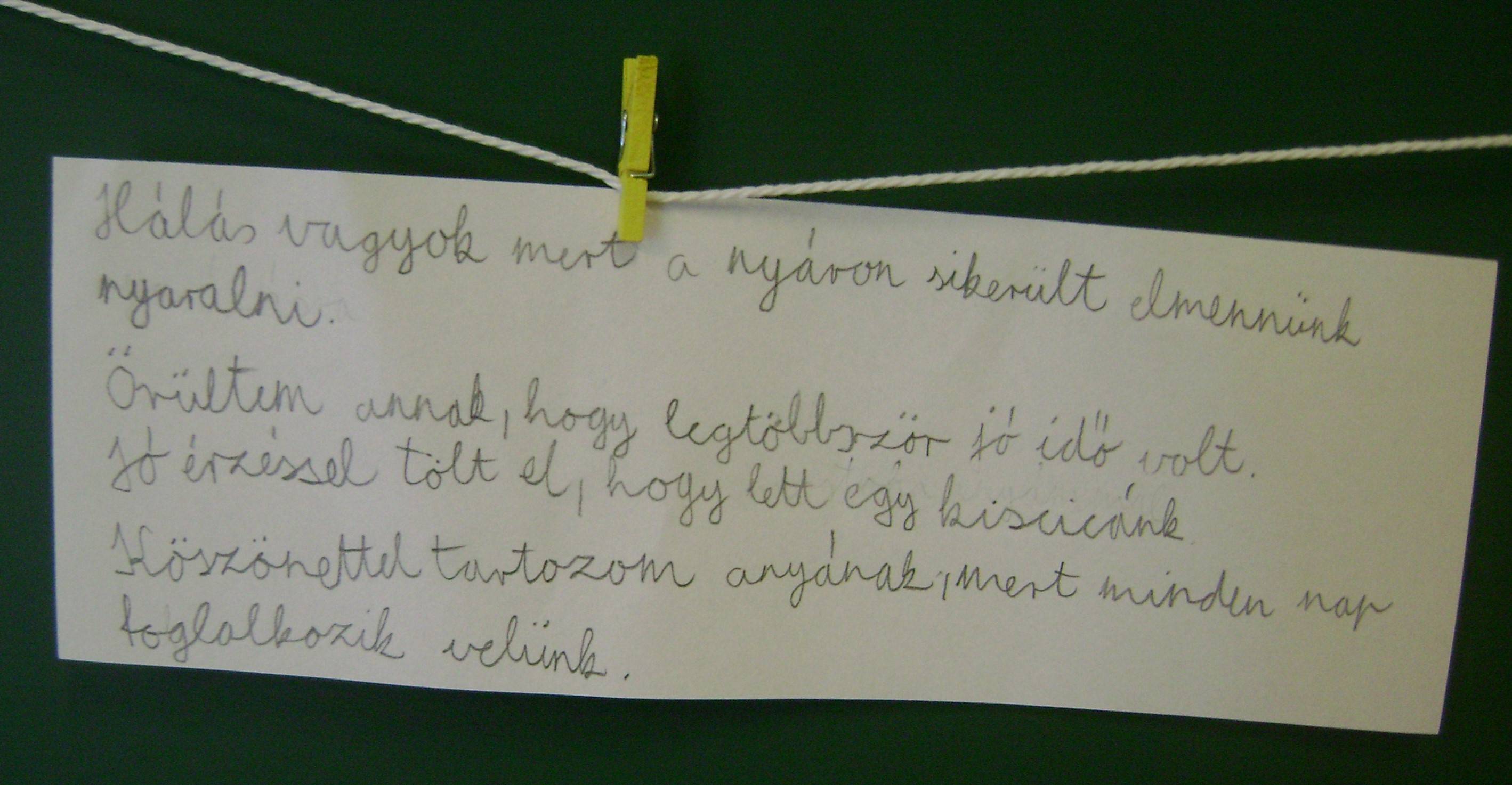 A 7. osztályos diákokkal hálaüzeneteket írtunk családtagjainknak, iskolai dolgozóknak, illetve az osztályterembe kihelyezett Hála üvegünket is megtöltöttük kedves gondolatokkal a szeptember hónaphoz kapcsolódóan. Elültettünk néhány virágmagot is, amelyeknek a földjét a hálagondolataink számának megfelelően kanalaztuk össze, így elegendő virágföld gyűlt össze az ültetéshez. A következő napokban kíváncsian várjuk majd, hogy mikor nyílik ki a hálavirágunk a termünkben.
