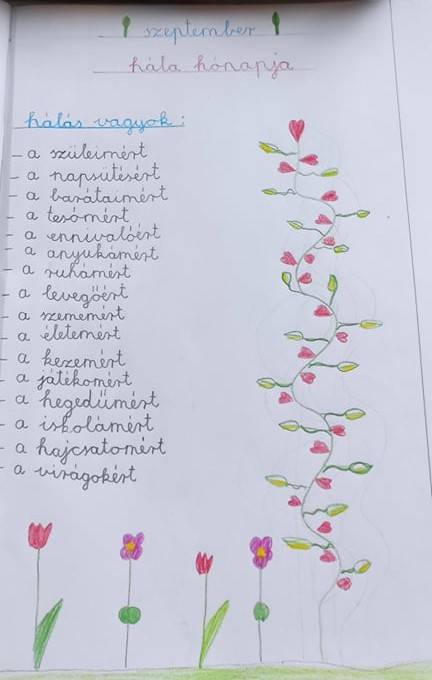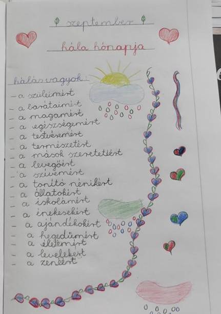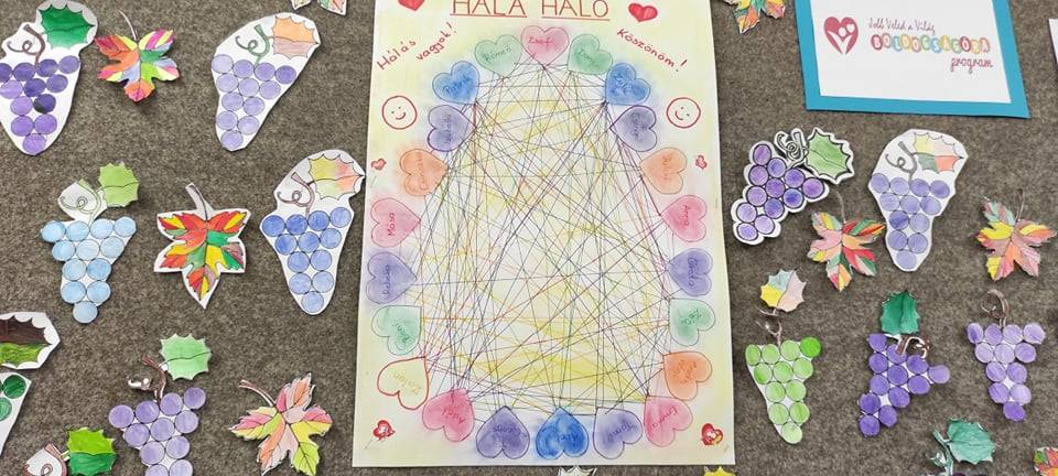 Nagy örömünkre újra elkezdődtek a boldogságórák. Az idén már második osztályosok vagyunk, így már tudunk írni és olvasni. Így elkezdhettünk a boldogságfüzetünkbe is írni. A hála témáját nagyon sikeresen feldolgoztuk. Mi minden héten tudunk órát tartani a napközis foglakozások keretében, így még több lehetőség van a havi téma feldolgozására, játékra, relaxálásra, zenehallgatásra. A megadott feladatsorokat elvégeztük.A gyerekek élvezték, hisz tapasztalható, érezhető volt a játékok, beszélgetések közben, hogy nyitottak a feladatokra. Szőttünk hálót fonalból ,majd a papíron folytattuk. 1 perc alatt kiraktuk a hála szót az osztályban található eszközökből. Énekeltük a Szép nap ölelj át című dalt. Azt tapasztaltam, hogy a hála kifejezése a beszélgetések kezdetén a kicsiknél, többnyire valami tárgyi dolgot kapok érzéshez kötődik jobban. Hálás vagyok a szülinapi ajándékért, a legóért, a babámért….stb. A hónap végére zárásként a füzetbe már egészen más dolgokért is hálásak voltak. Egyébként alapból a gyerekek érzelmi intelligenciája megfelelő szinten van, de vannak azért nehezebb esetek is , akiknek különösen hasznosak ezek a játékos, ám még is fontos dolgokat érintő órák. Meglepő volt számukra, hogy mi mindenért lehetnek még hálásak….. Hálásan köszönünk mindent amit a hála hónap tanított nekünk, és várjuk a következő hónap feladatait is.