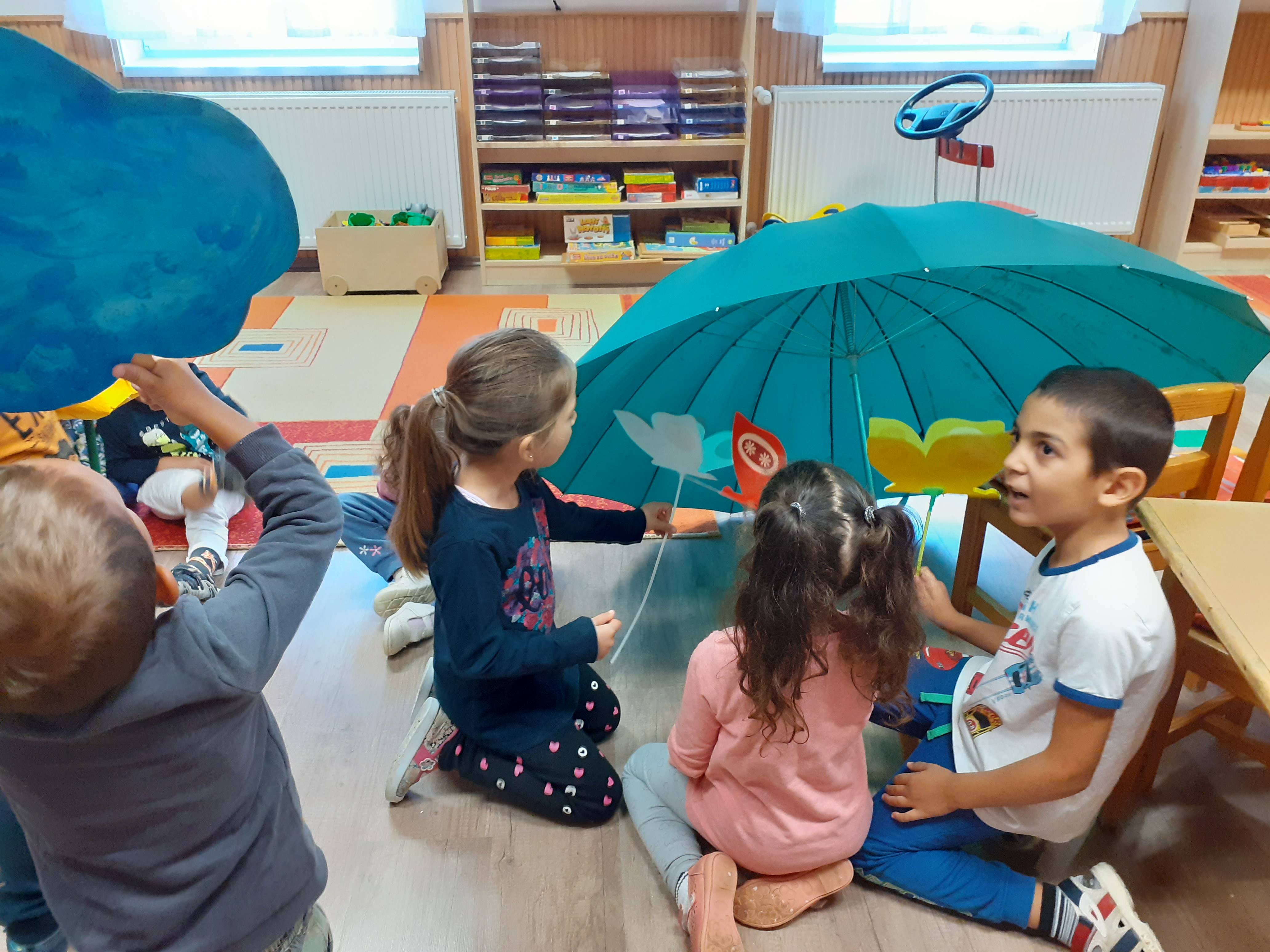 A téma feldolgozásához a Három pillangó című mesét választottuk. Több napon keresztül meséltük, minden alkalommal a mesehallgatást Gryllus Vilmos: Lepke és virág című dallal zártuk. Többszöri meghallgatás után feldolgoztuk a mesét. Tenyérnyomattal napocskát készítettünk, felhőt festettünk, eldramatizáltuk többször is, hogy mindenki szerepelhessen. Beszélgettünk arról, hogy a pillangók milyen nehéz helyzetbe kerültek és hogy a napocska segített rajtuk. Hálásak neki ezért. Beszélgettünk arról, hogy a saját életében ki kinek miért hálás. Mozgás foglalkozáson is pillangók voltunk. Repdestünk, ha dörgött akkor leguggoltak a „kis pillangók”, ha kisütött a nap akkor repdestek. A “Szép nap, ölelj most át engem” kezdetű dal hallgatása közben ellazultunk, relaxáltunk.