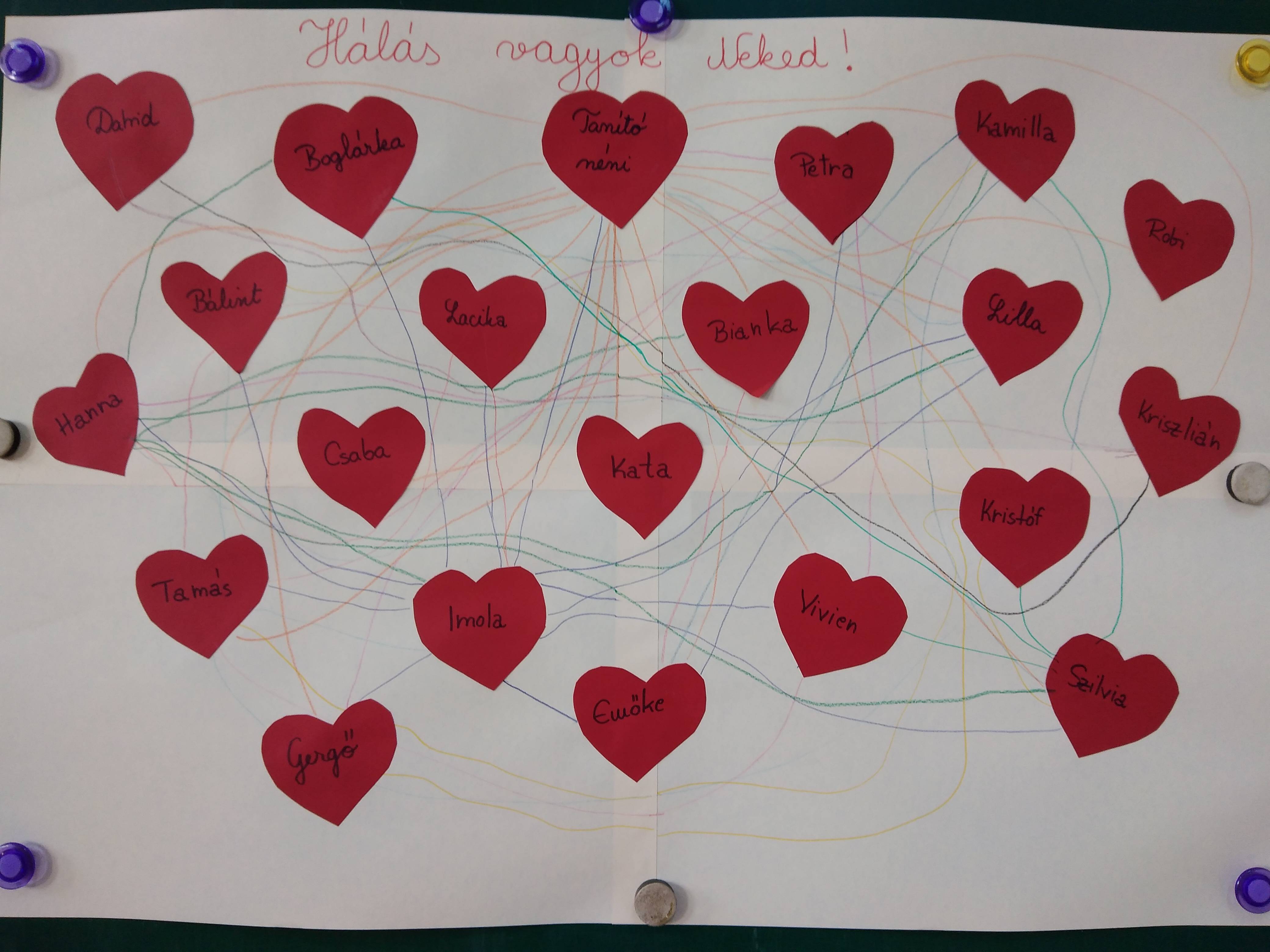 -De hogyan tegyünk érte? Aztán csürtük-csavartuk a témát, és oda jutottunk, hogy akkor vagyunk igazán boldogok, ha hála van a szívünkben. A táblára felírtuk miért lehetunk hálásak. Én látom a gyerekeken, hogy tényleg próbálják alkalmazni azokat a tanácsokat, technikákat, amiket nekik ajánlok. Tiszta szívű, jó közösséggé formálódtunk, akik jól érzik magukat együtt. Két új kislány csatlakozott hozzánk ebben a tanévben, és olyan jó volt látni, ahogyan segítik őket beilleszkedni a gyerekek. Igazán könnyű dolgom volt. A sok munkámnak most érzem a gyümölcsét.Amikor készült a hálából szőtt hálót, akkor láttam, mennyire figyelnek egymásra a gyerekek. Minden apró dolognak örülnek, amit egymásnak adhatnak. Hálás vagyok, hogy így dolgozhatok, hogy a gyerekekkel együtt haladhatok apró léptekkel a kitűzött célunk fele- a minél boldogabb élet – megvalósításával.
