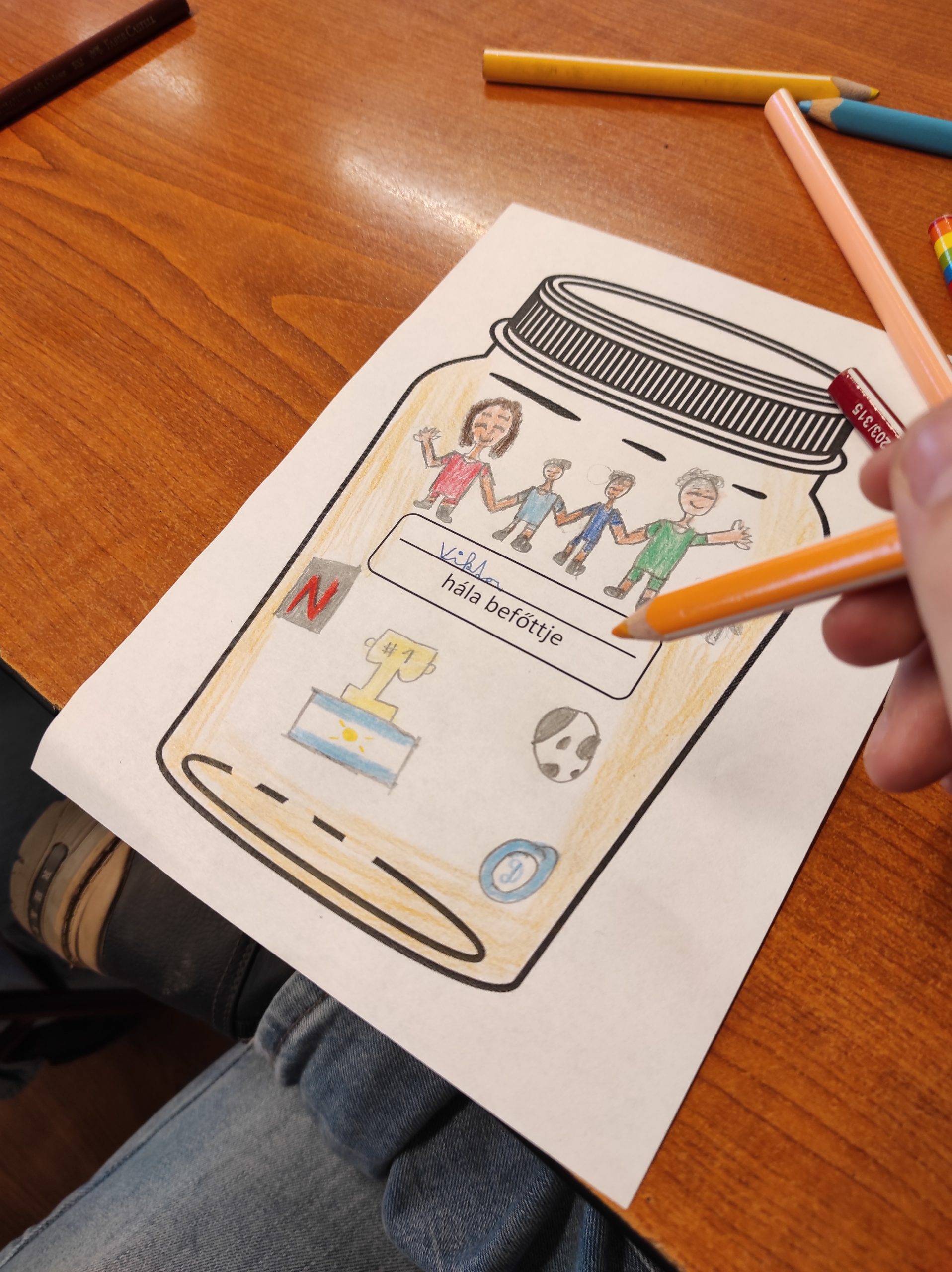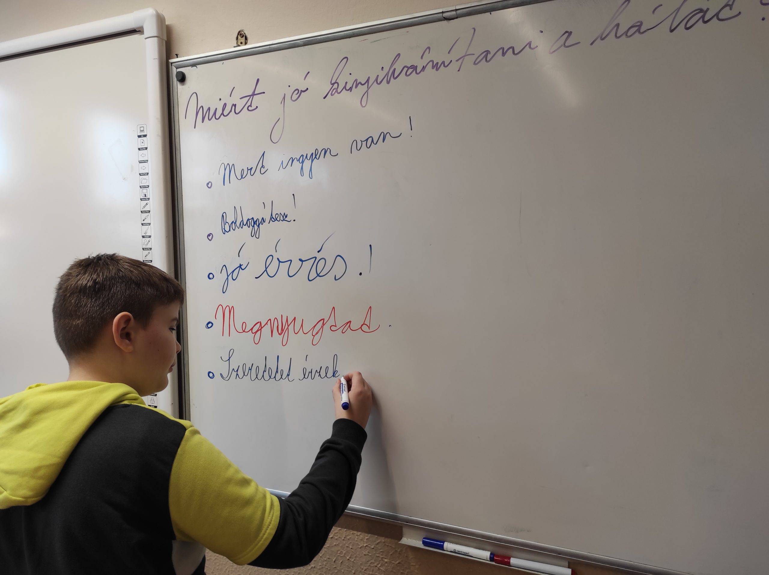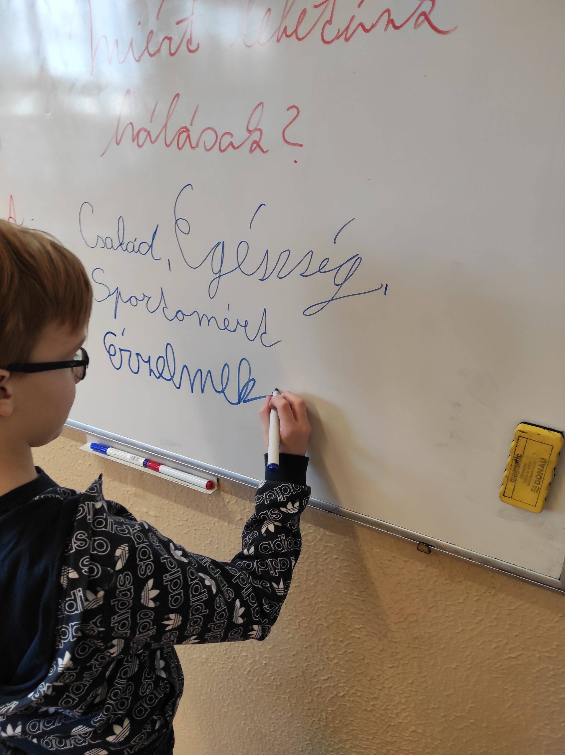A gyerekekkel a hálával foglalkoztunk. Elbeszélgettünk a hála fogalmáról. A bevezető beszélgetést követően két kérdés került a táblára: Miért lehetünk hálásak? Miért jó kinyilvánítani a hálát?