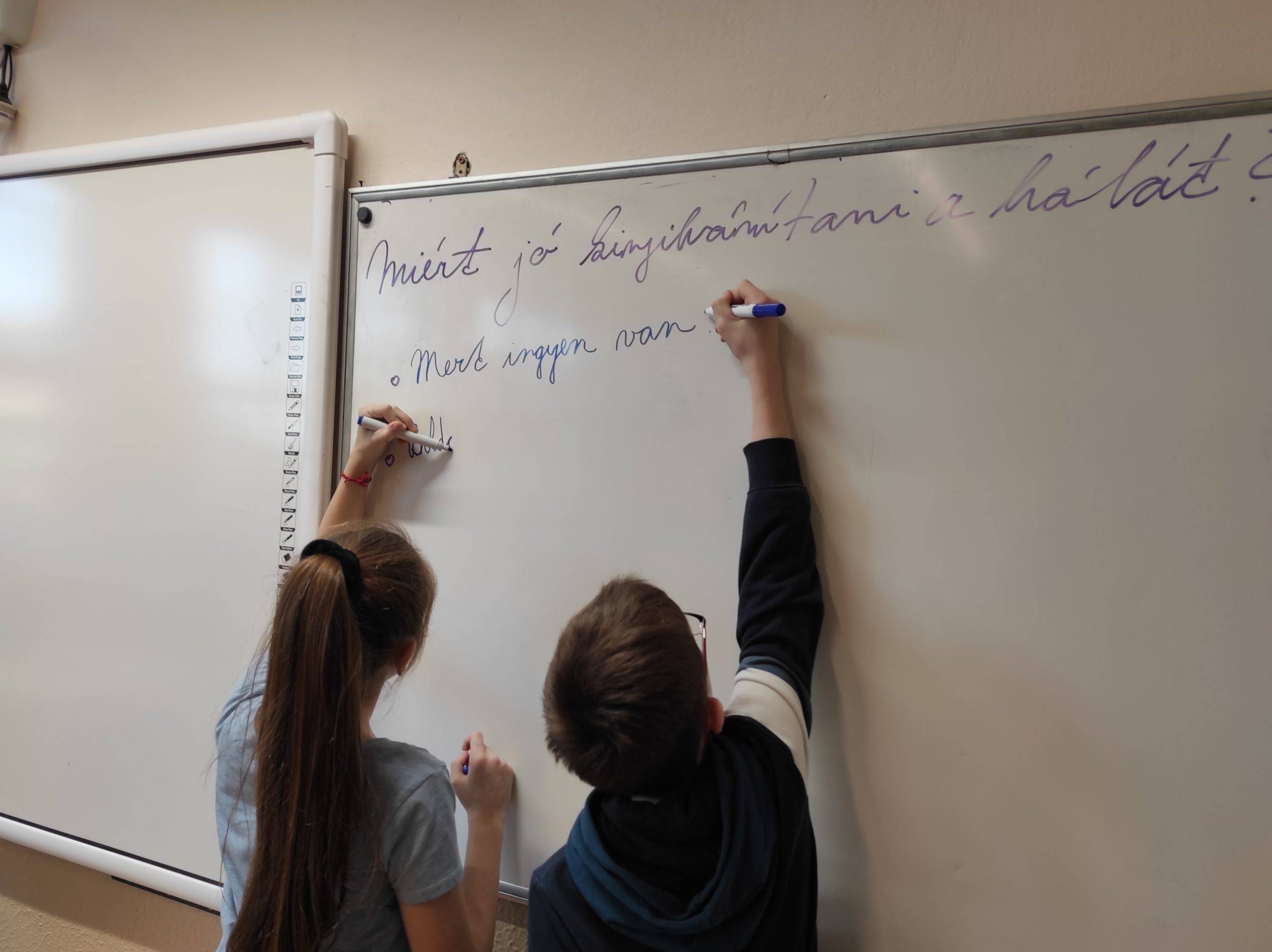 Akik úgy érezték, hogy tudnak felelni a kérdésekre, felírták a válaszukat a táblára a kérdés alá.