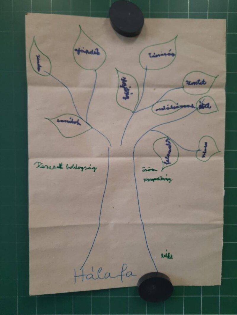 Az órán közösen feldolgoztuk a témakörhöz tartozó tanmesét, majd körbeülve megbeszéltük, hogy mit jelent a hála, mikor érezhetünk hálát, milyen érzések kapcsolódnak hozzá. Majd mindenki egyesével elmondta, hogy ő miért hálás a legjobban. Ezután elkészítettünk egy hálafát. A fa leveleibe beleírtuk, hogy mikor érezhetünk hálát, a fa köré pedig azokat az érzéseket írtuk, amit akkor érzünk, mikor hálásak vagyunk.