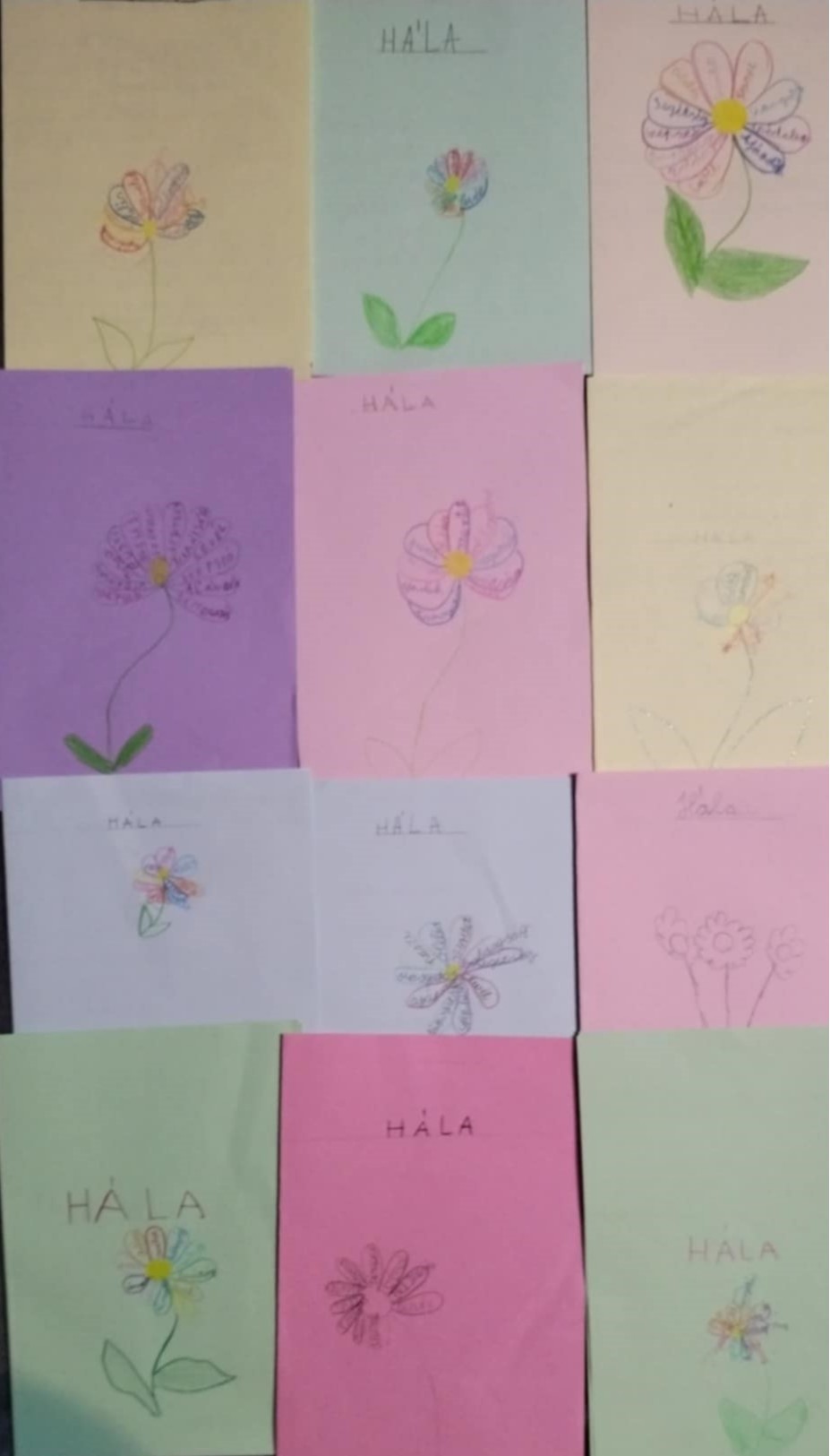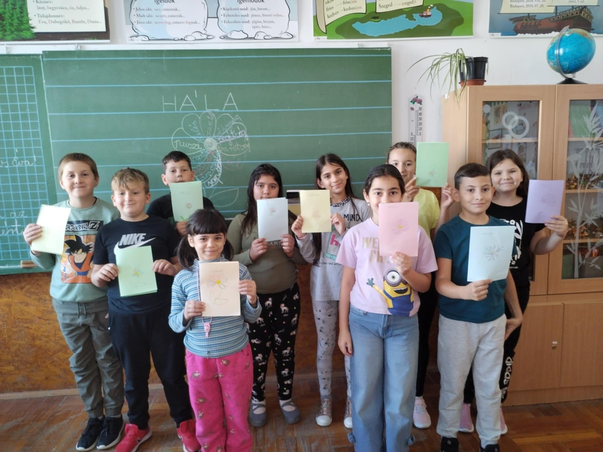 Negyedik osztályos tanulók először a hála kifejezését próbálták szavakba szedni. Megrajzoltak egy virágot, ebbe próbálták virágszirmokban összegyűjteni, hogyan fejezhetjük ki a hálánkat. Amilyen színes a gyerekek képzelete, olyan színes virágok születtek. Szinte már nem is fértek a szirmok a virágokon.