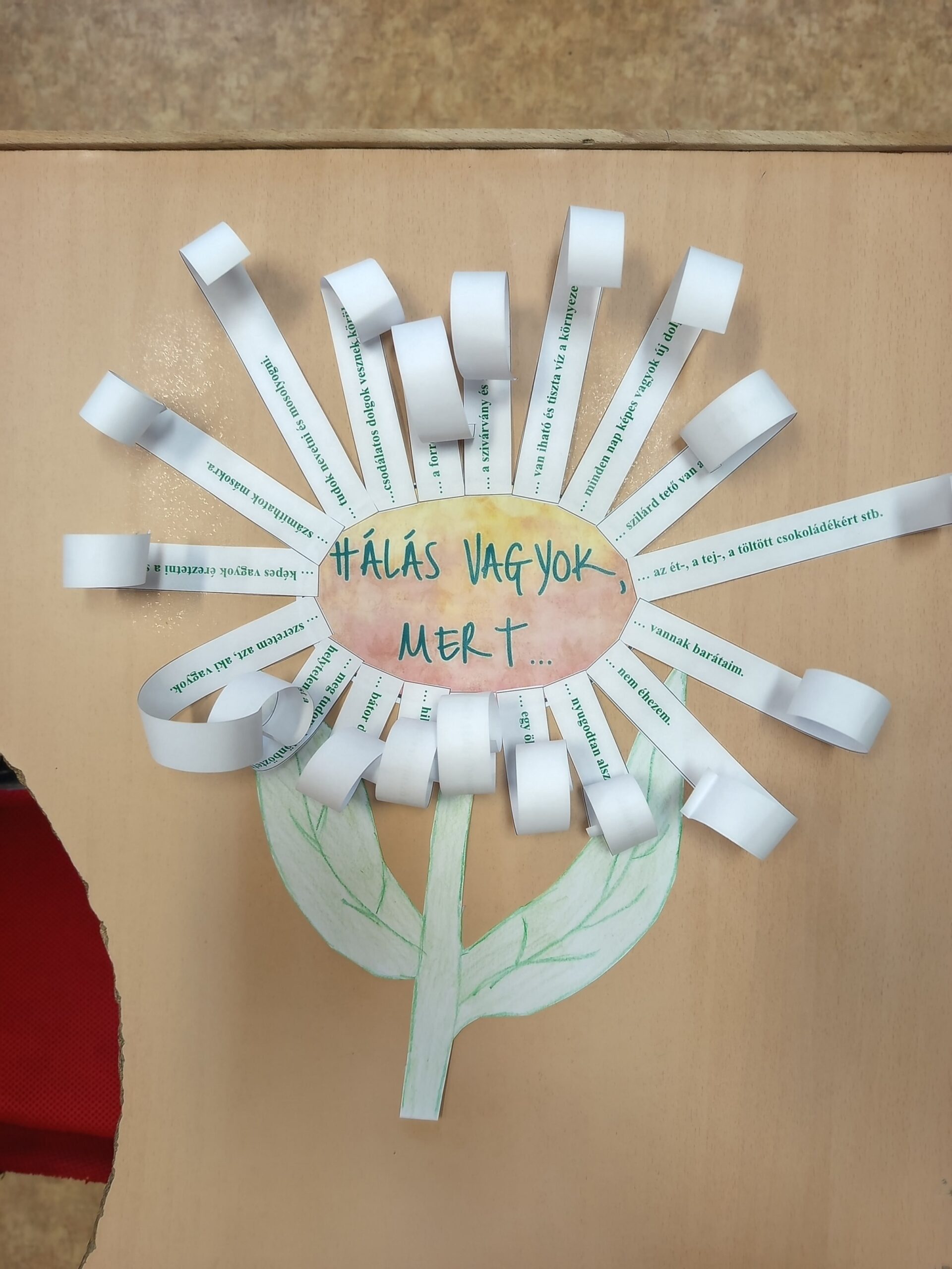 A megfelelő hangulat megalapozása után megbeszéltük az óra témáját, elemeztük a hála szó jelentését, majd egy zsákból előkerült a HÁLÁS VAGYOK, MERT… mondatkezdet.