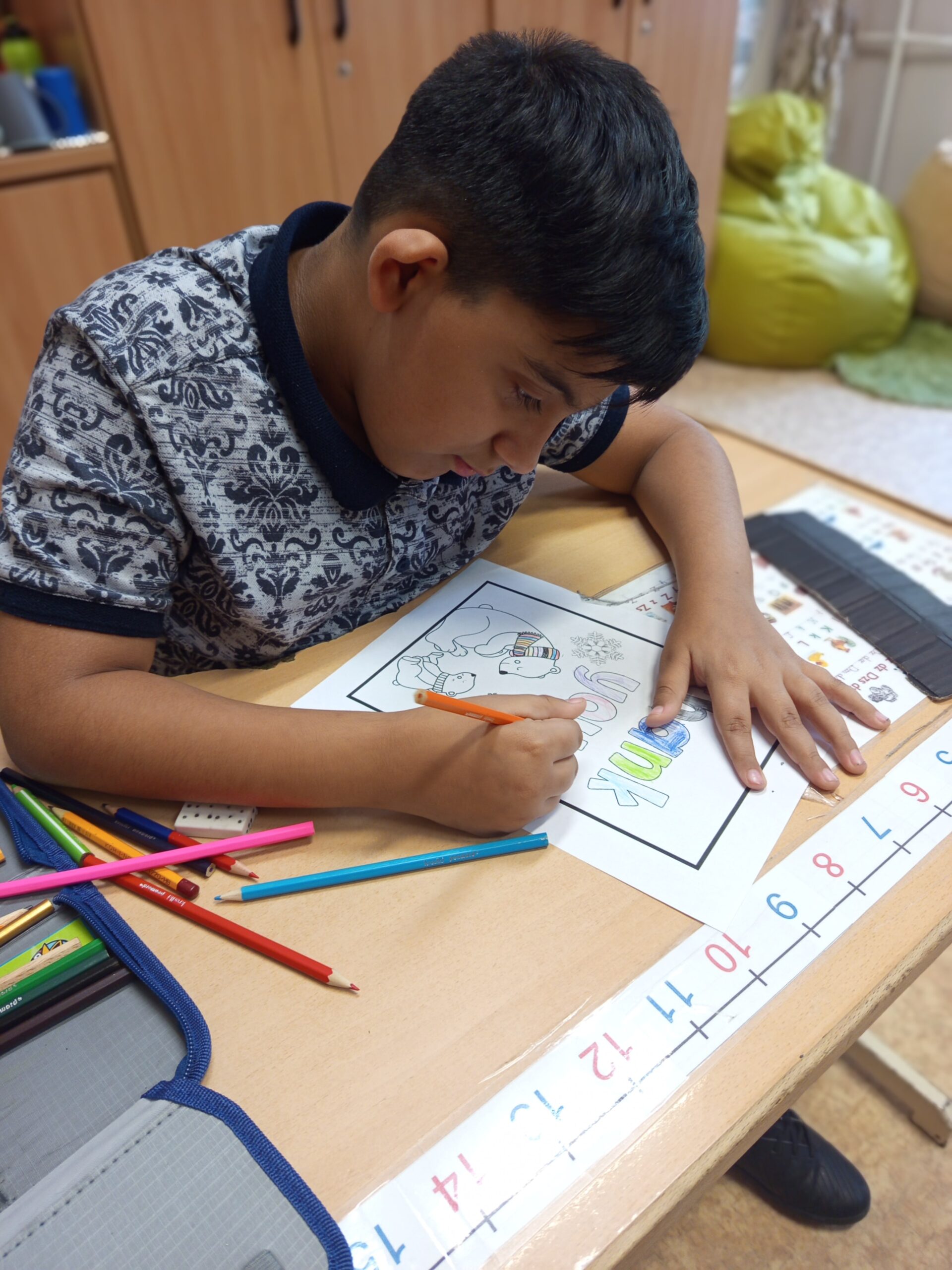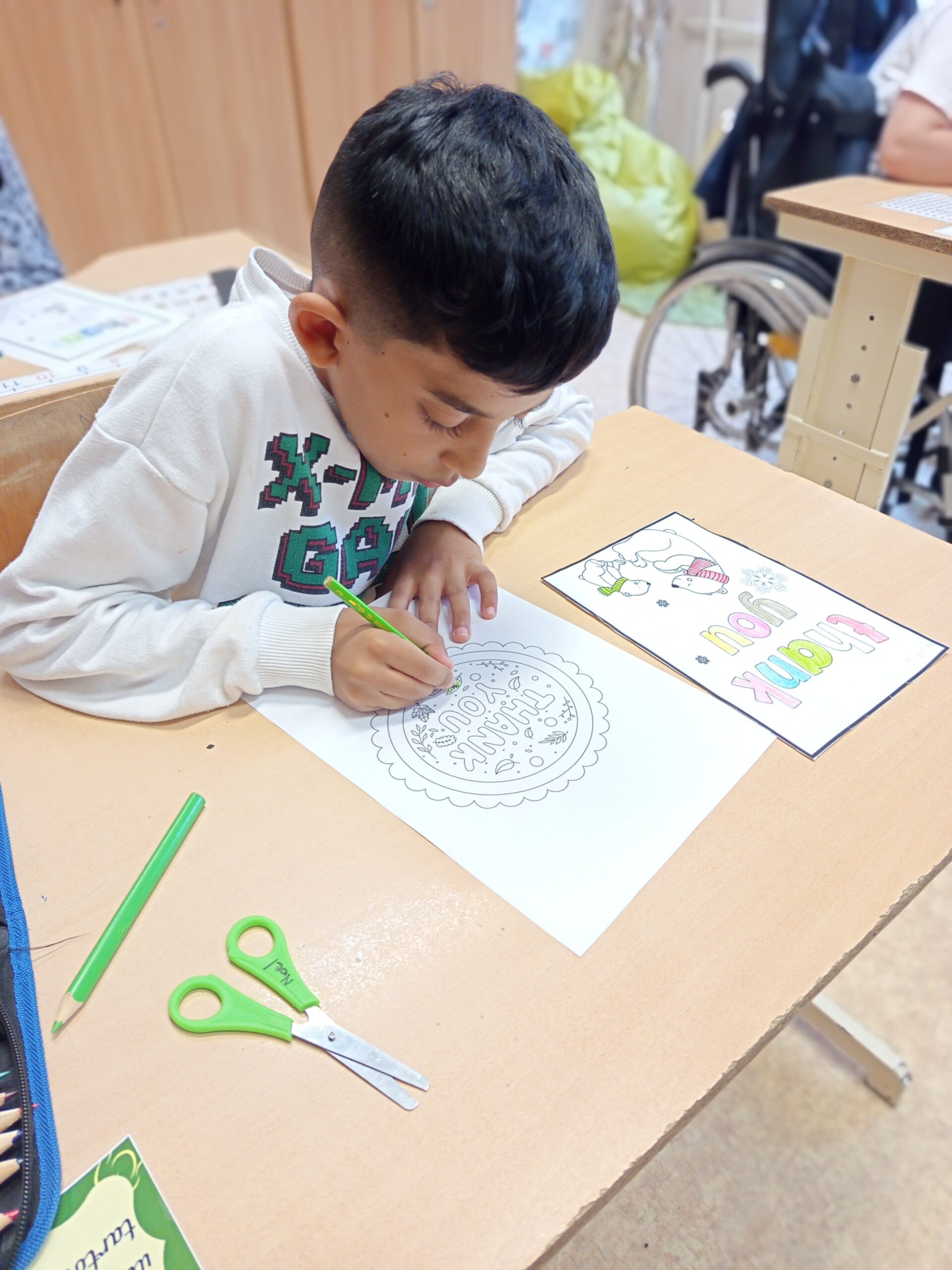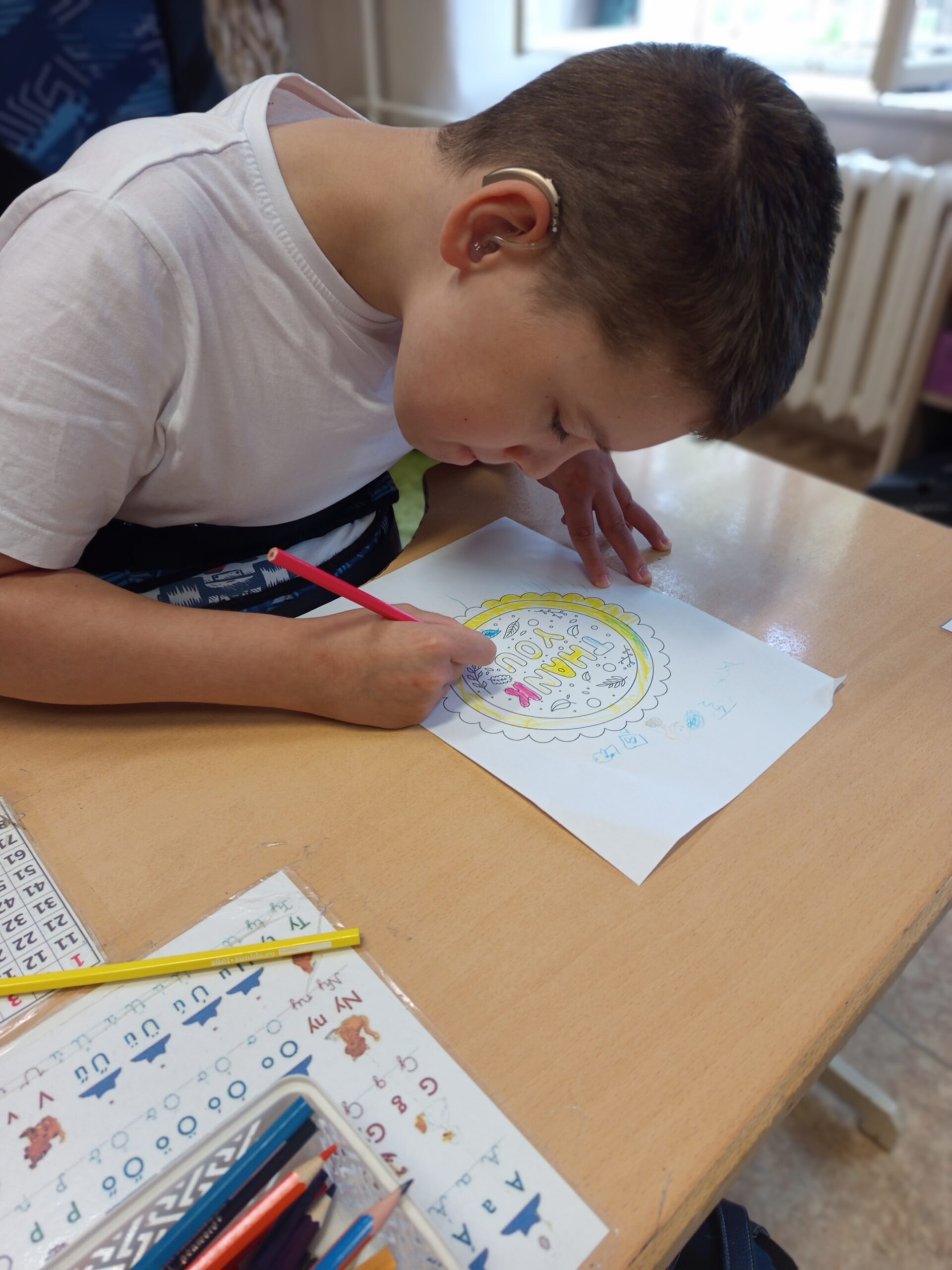 A tanóra végén zenehallgatás mellett minden gyermek színezhetett hálából egy-egy képet az általa kiválasztott családtagnak, felnőttnek.