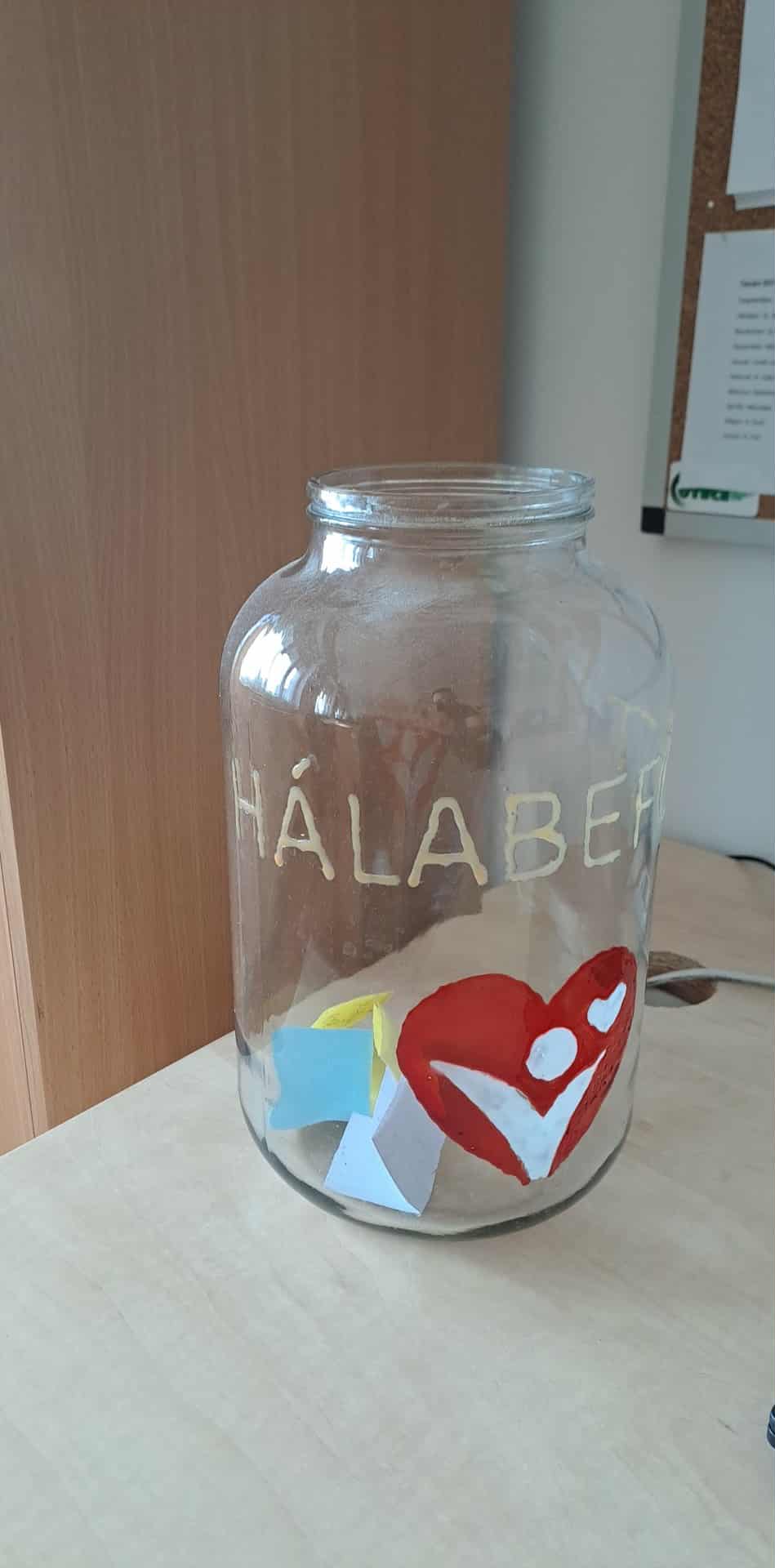 Ezenkívül a tanáriszobánkba készítettem egy hálabefőttet, melyet immár 3. éve töltögetünk, majd minden tanév elején töltekezünk a belekerült hálaüzenetekkel.