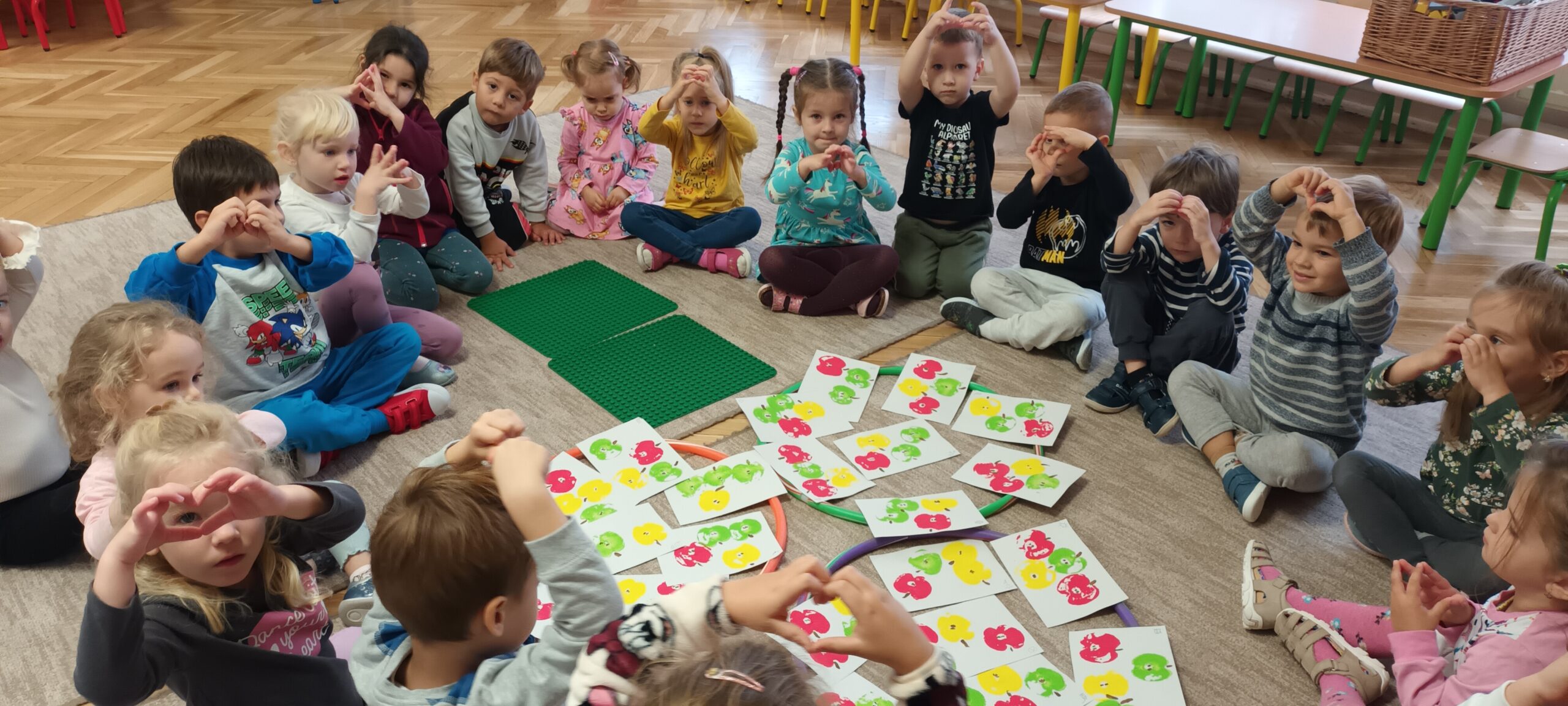 – Hálafa készítése a szőnyegen Legó építő lapokból, és előzőleg papírra nyomdázott almákból.