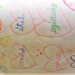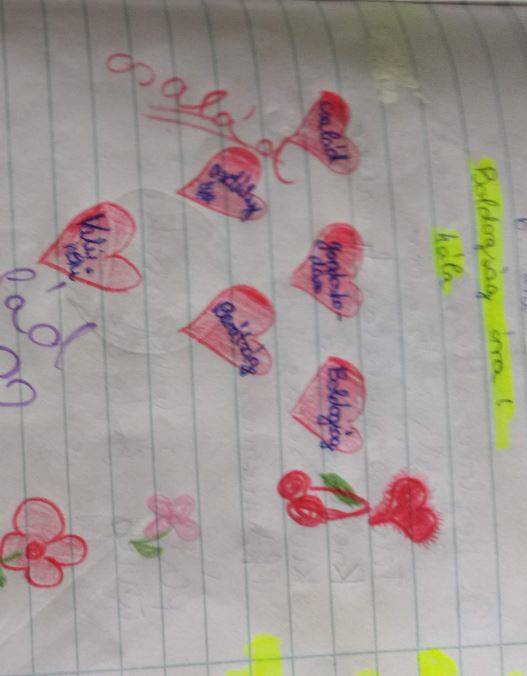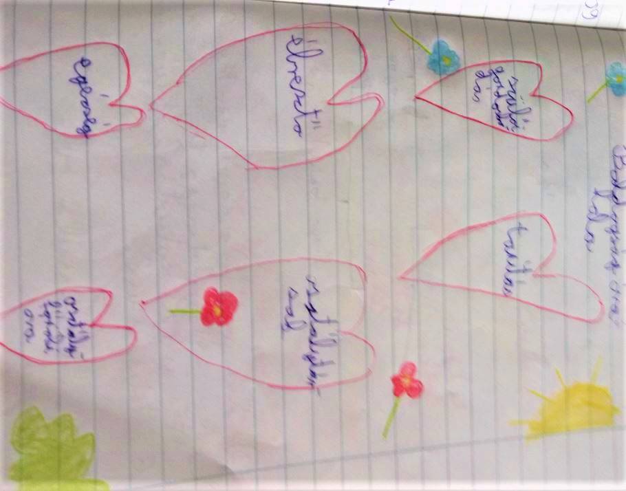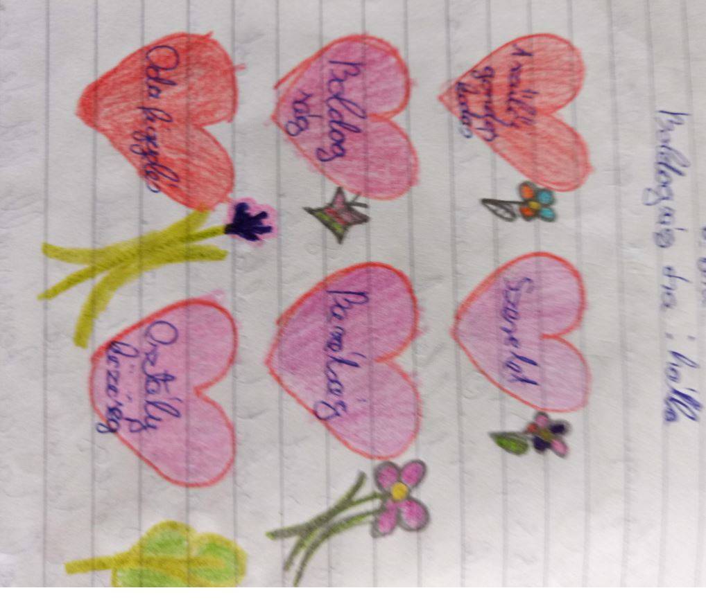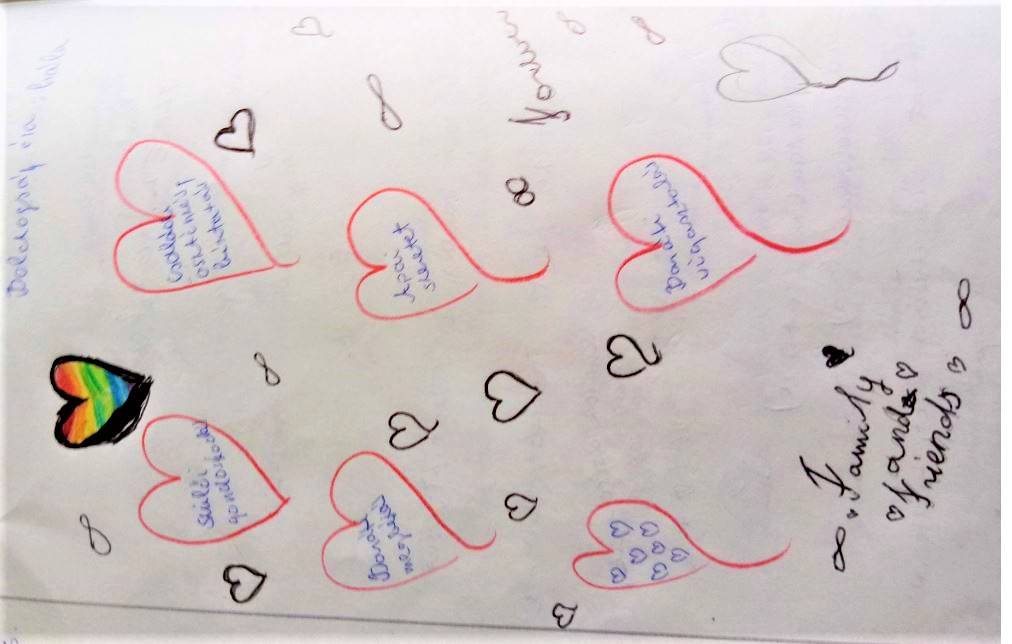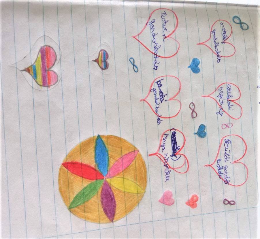 A vélemények meghallgatása után minden tanuló a saját osztályfőnöki füzetükbe rajzolt 6db szívet. Minden szívbe egy-egy szó/gondolat került, amiért a tanuló hálát érez. Akinek volt kedve felolvashatta ezeket a szavakat, gondolatokat. Nagy öröm volt számomra, hogy több füzetben is megjelent az osztályfőnöki óra. Végül én is elmeséltem a gyerekeknek, hogy én miért vagyok hálás az életemben.