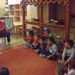 Ezután Bezzeg Andrea: Hálafa című meséjének elmondása. A meséhez színes leporellót használtam. A mese elmondása után beszélgetés a meséről, tanulságokról. Hálafa készítése tenyérnyomattal, az őszi levelek színeivel (narancssárga, piros, zöld, citromsárga). Minden gyermek amikor rányomtam a kezét a fára elmondta, hogy a mai napon kinek és miért hálás.