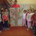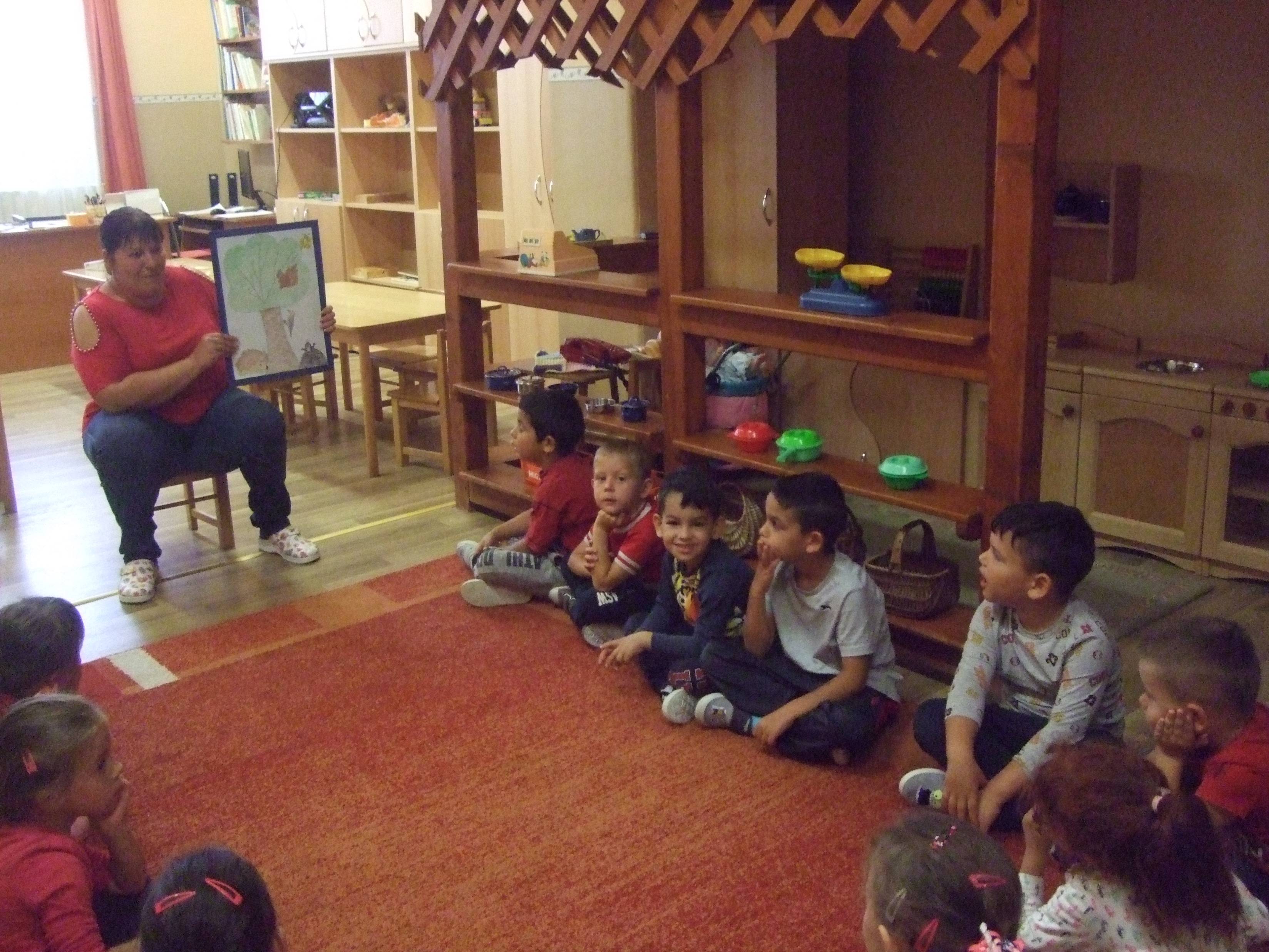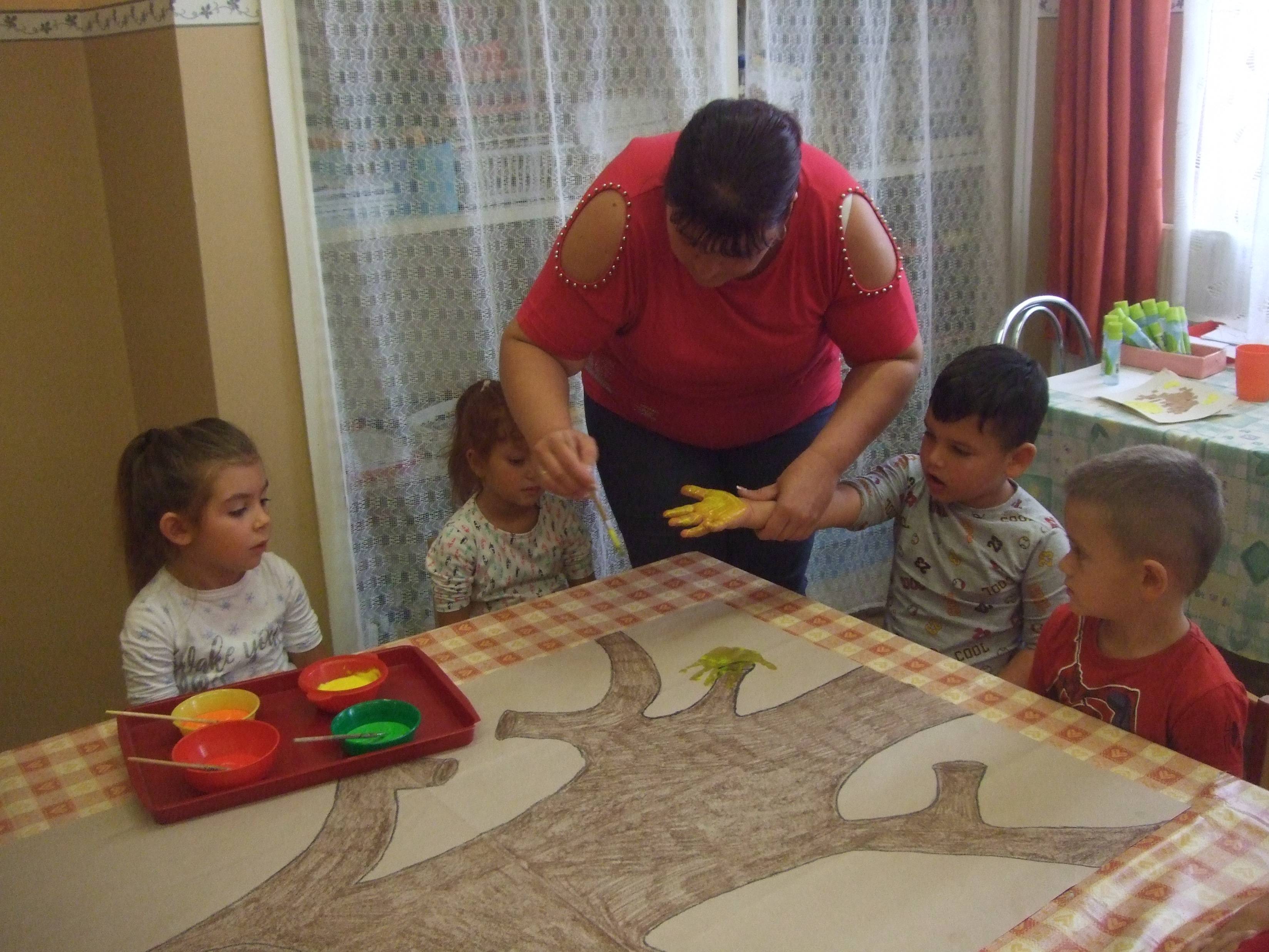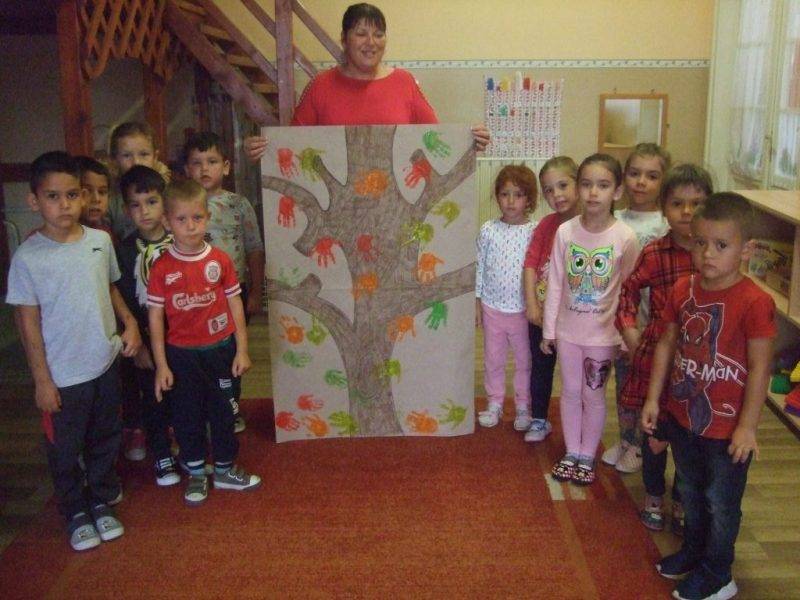 Ezután Bezzeg Andrea: Hálafa című meséjének elmondása. A meséhez színes leporellót használtam. A mese elmondása után beszélgetés a meséről, tanulságokról. Hálafa készítése tenyérnyomattal, az őszi levelek színeivel (narancssárga, piros, zöld, citromsárga). Minden gyermek amikor rányomtam a kezét a fára elmondta, hogy a mai napon kinek és miért hálás.