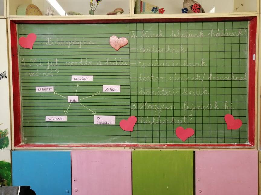 A foglalkozás elején tisztáztuk a hála szó jelentését, gondolathálót készítettünk a táblára. Aztán beszélgettünk arról, hogy kinek és miért lehetünk hálásak. A gyerekek meglepően sok példát hoztak fel a témában.