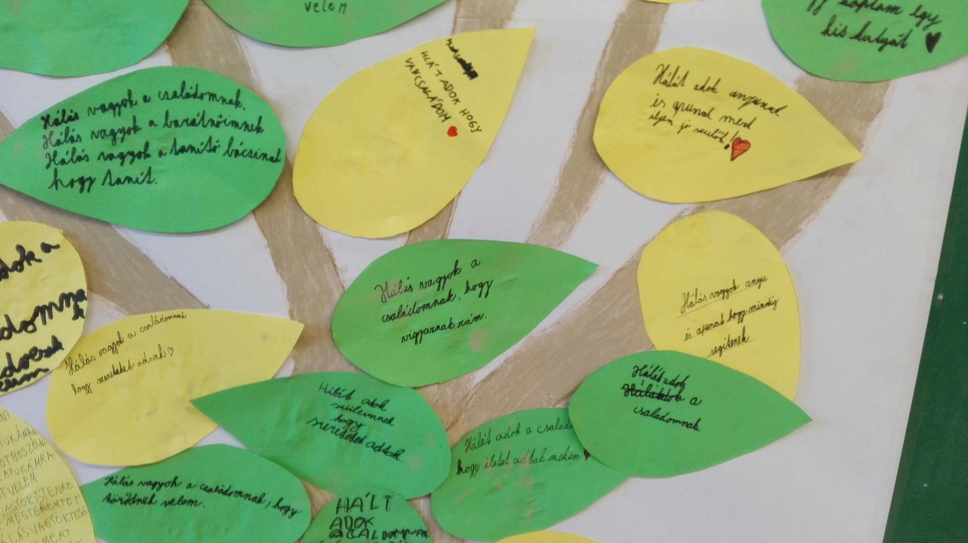 A negyedikesek az órát a „Szép nap, ölelj át engem“ című dal meghallgatásával kezdték. Ezután rövid beszélgetést folytattak a „Kinek lehetünk hálásak és miért“ témakörről. Ezt követően hálaleveleket írtak, melyeknek falevél formájuk volt és egy hálafára helyezték fel. Majd az őszi szél elfújja róluk az üzeneteket a címzetteknek. Végül az órát a „Csodakantár“ című mese meghallgatásával zárták.