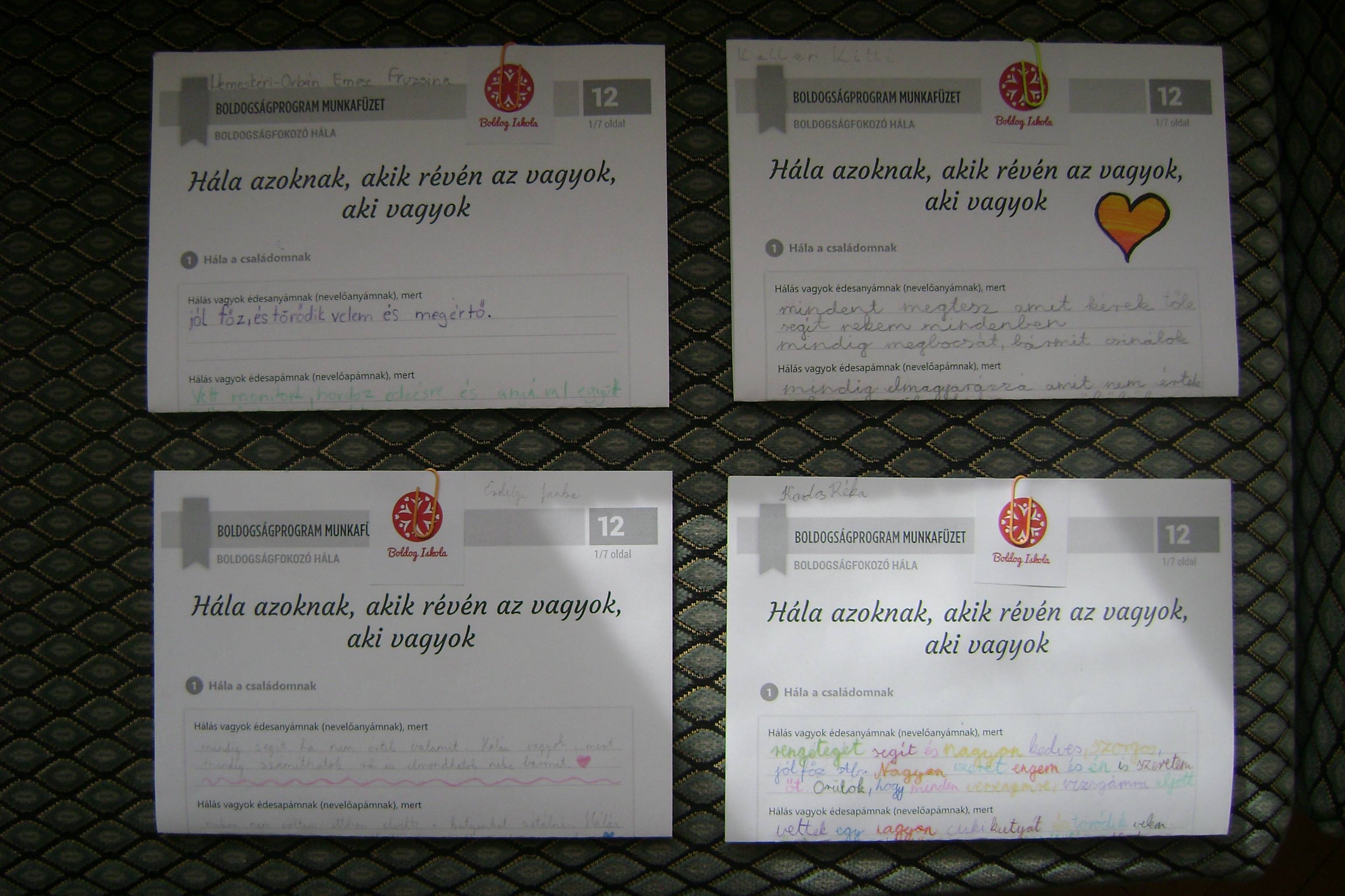 A diákokkal elkészítettük a Hála napló első részét, amely során a családtagoknak írtuk le, hogy miért mondhatunk köszönetet. Ezeket a gondolatokat a szeptemberi szülői értekezleten kiosztottam a szülőknek, így emlékbe megmaradnak ezek a pozitív gondolatok számukra.