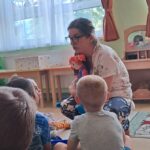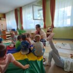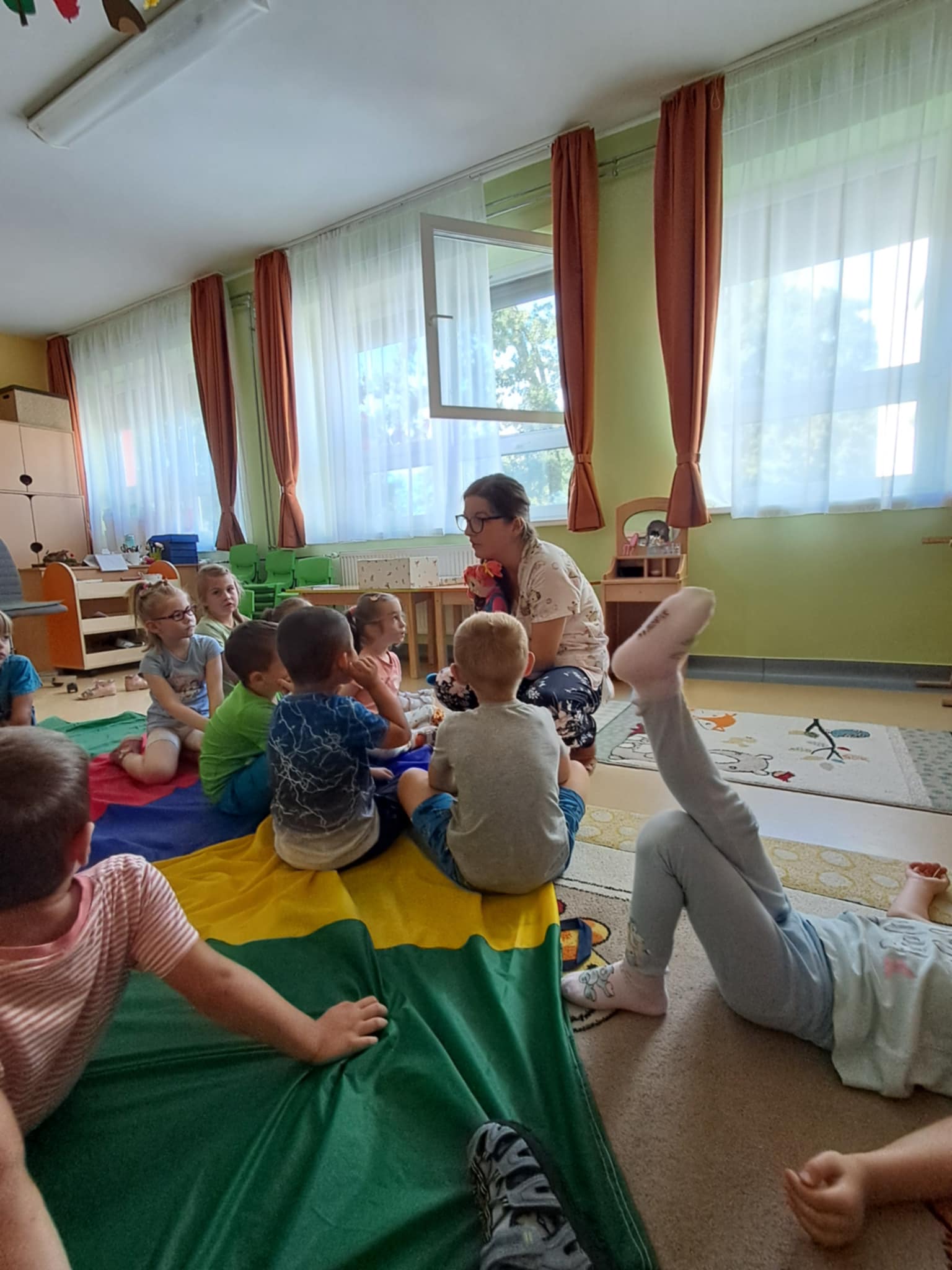 Ezt követően Boldog Dórával együtt bemutattuk a mi kis léghajónkat. Elmondtuk, hogy varázslatos helyekre utazunk majd el minden alkalommal és játszunk is majd vele sokat. Aztán kört alakítottunk és a színes szivárványos ejtőernyőnkkel „elszálltunk” Hála földre. Ahogy leszálltunk, a gyermekek helyet foglaltak az ejtőernyőn és Boldog Dóra a háláról kérdezte őket. Igyekeztünk együtt kitalálni, mi is lehet ez a szó. Nehezen találtuk meg a jelentését, így segítségül hívtuk a Hálafa történetét. A mese után a gyermekek kicsit közelebb kerültek a fogalomhoz. Megbeszéltük, hogy ezt követően figyelünk rá, hogy társainkkal úgy bánjunk, hogy hálásak lehessenek nekünk.