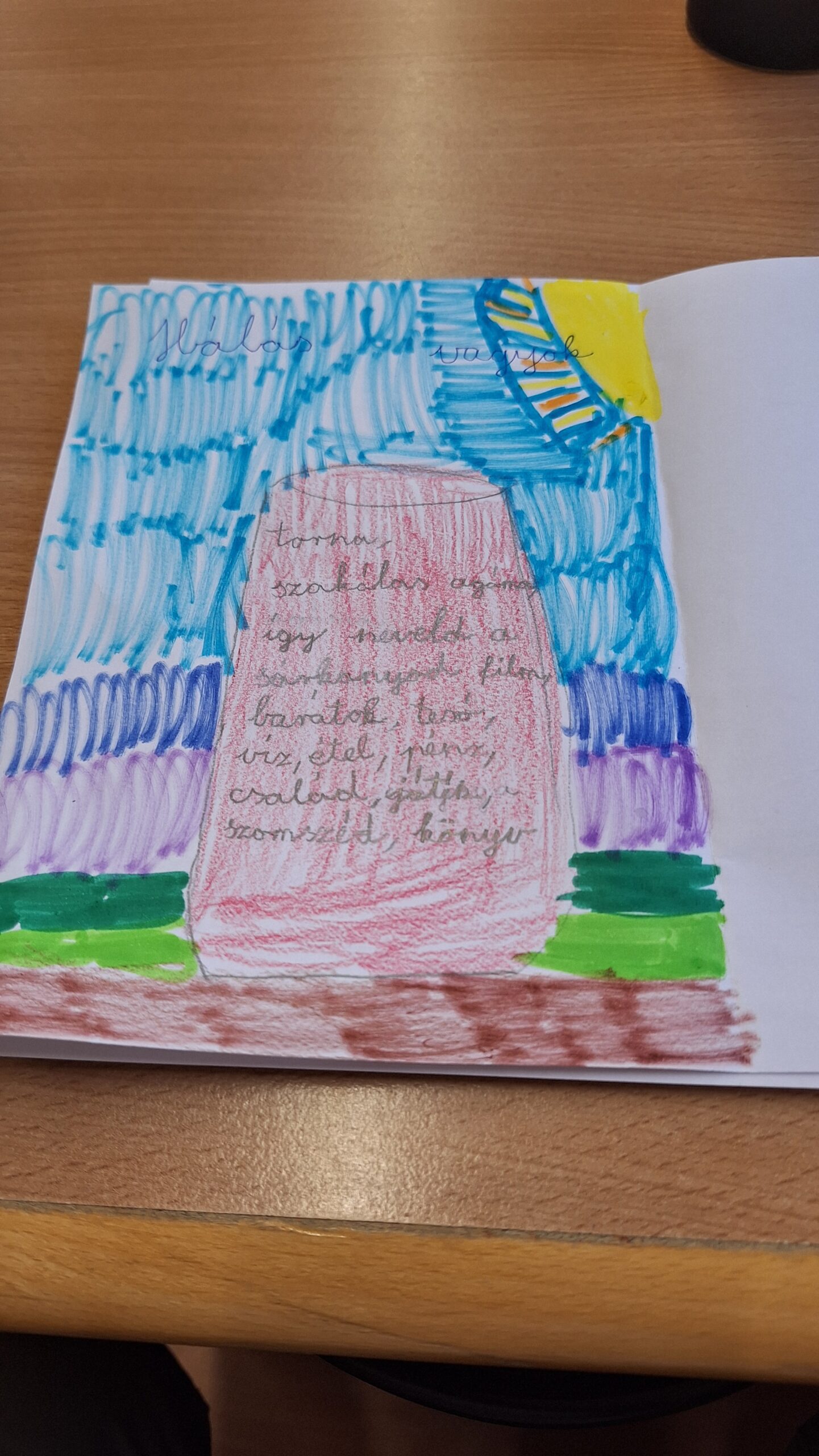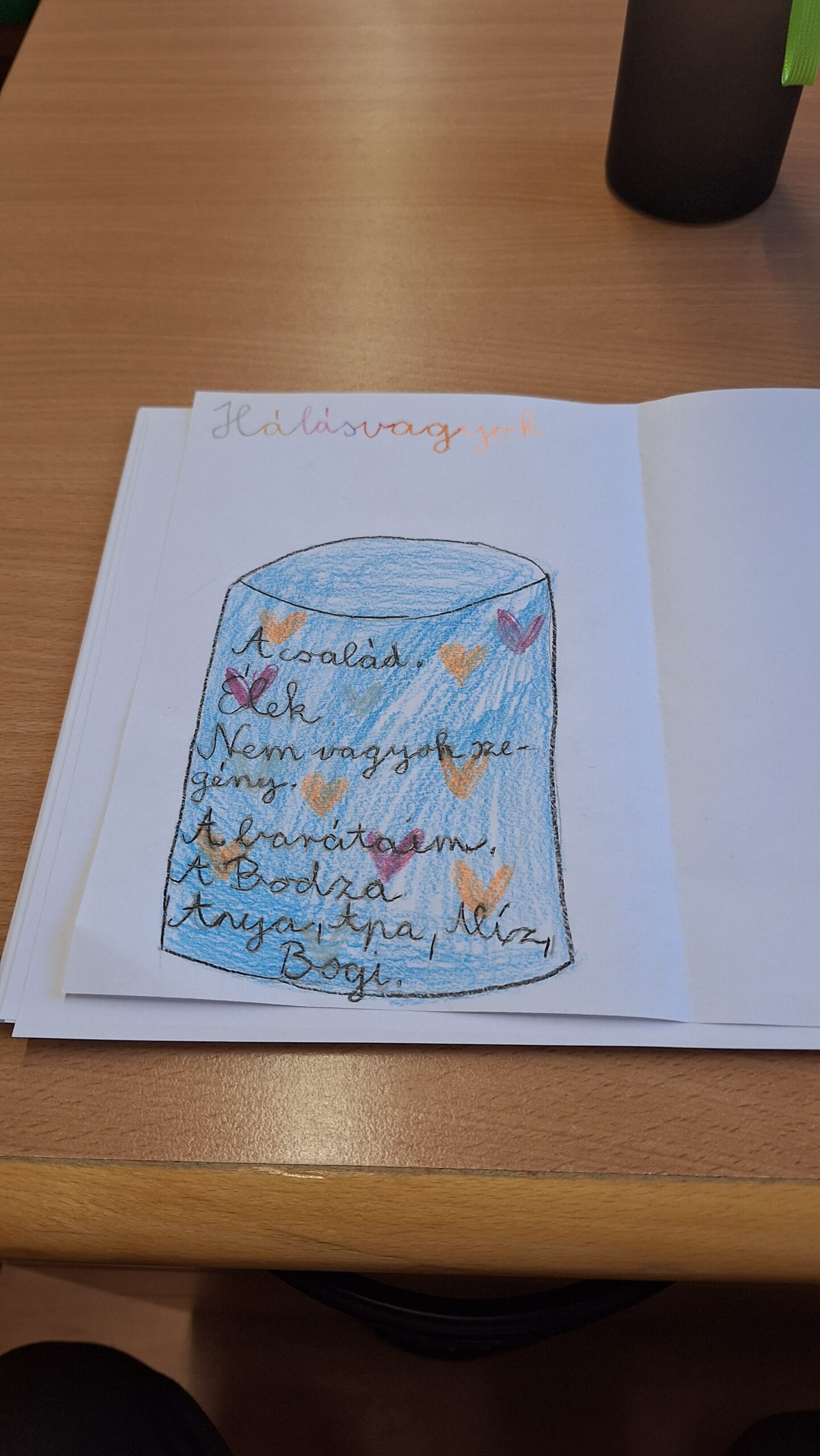 Az óra a „pohár víz” metaforára épült, amely megmutatta, hogy a napunkat élhetjük félig üres vagy félig teli szemlélettel attól függően, mire figyelünk. A gyerekek megtapasztalták, hogyan változik a hangulatuk, ha a nehézségek helyett a hálára és a pozitív dolgokra irányítják a figyelmüket. A rajzos gyakorlat során mindenki elkészítette a saját „boldogságpoharát”, és összegyűjtötte, mi mindenért lehet hálás, majd erről párokban is beszélgettek. Otthoni feladatként a családdal közösen folytatták a hálagyűjtést, hogy reggelente ránézve tudatosan pozitívan induljon a napjuk. Az óra végén egy játékos ismerkedős feladat erősítette az önismeretet és a közösségi kapcsolódást.