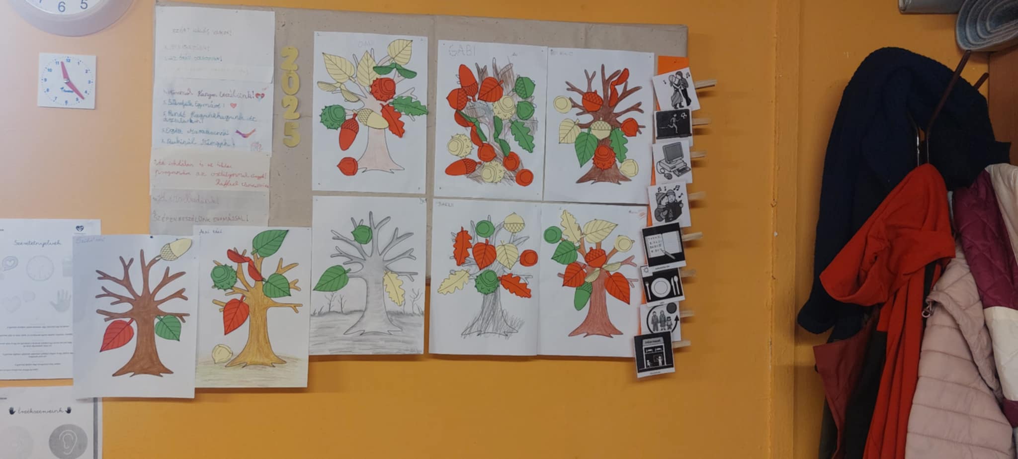 Az osztállyal közösen készítettünk őszi fákat, amelyekre színes falevelek ragasztottunk, ha valaki valakinek hálás volt valamiért. Ez a tevékenység a Hálagyöngysor feladat módosított változataként valósult meg, mivel a gyöngyfűzés nálunk nem volt kivitelezhető. A hónap végén megfigyeltük, hogy kinek a fája lett a leglombosabb.
