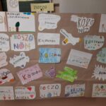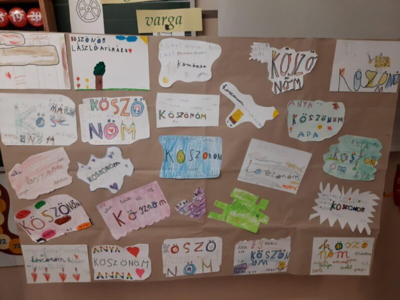 Óra végén a Hálaerősség dalára rajzoltunk. Mindenki leírta a rajzlapra a KÖSZÖNÖM szót, kiszínezték, dekorálták és a szó köré írták azoknak a nevét, akinek hálásak. Az így elkészített rajzokból hálafalat készítettünk.