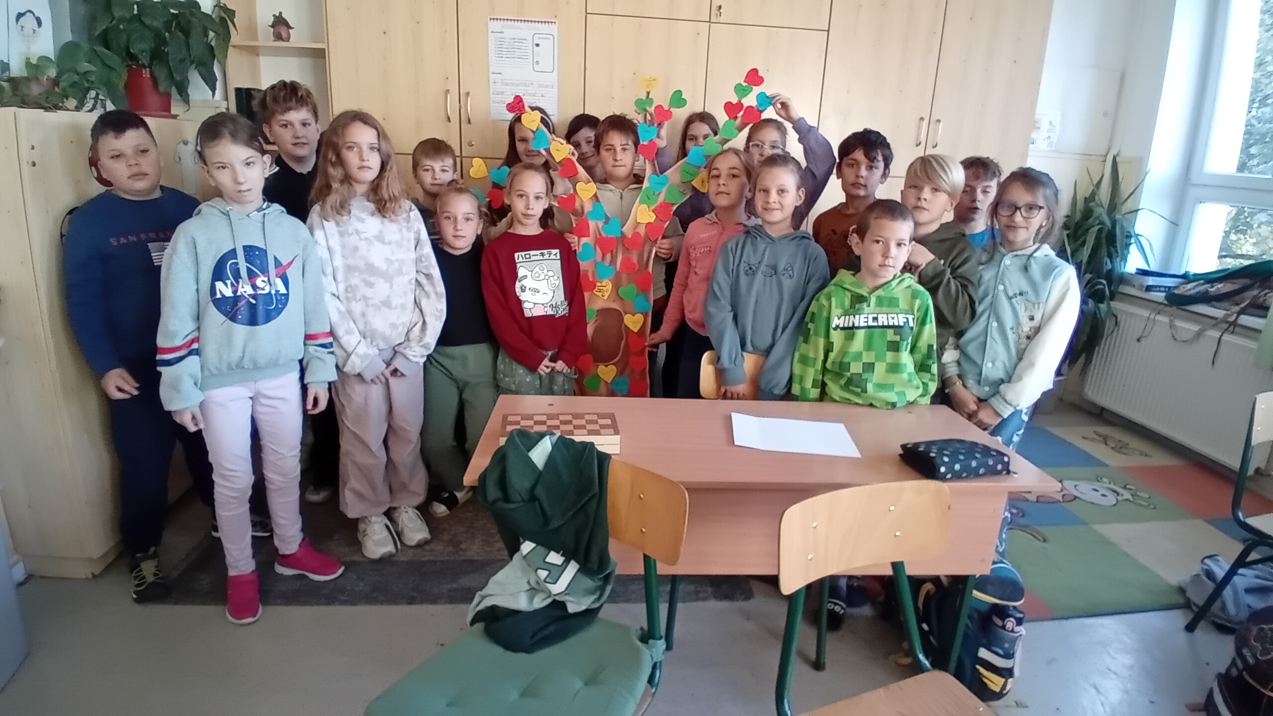 A beszélgetés után mindenki színes szívecskéket kapott. Erre felírták, hogy ki, miért hálás. A szívecskéket egy óriási, általam készített fára ragasztottuk. A kész hálafát kitettük a folyósóra, így az iskola többi kisdiákja is tanulmányozhatta azt.