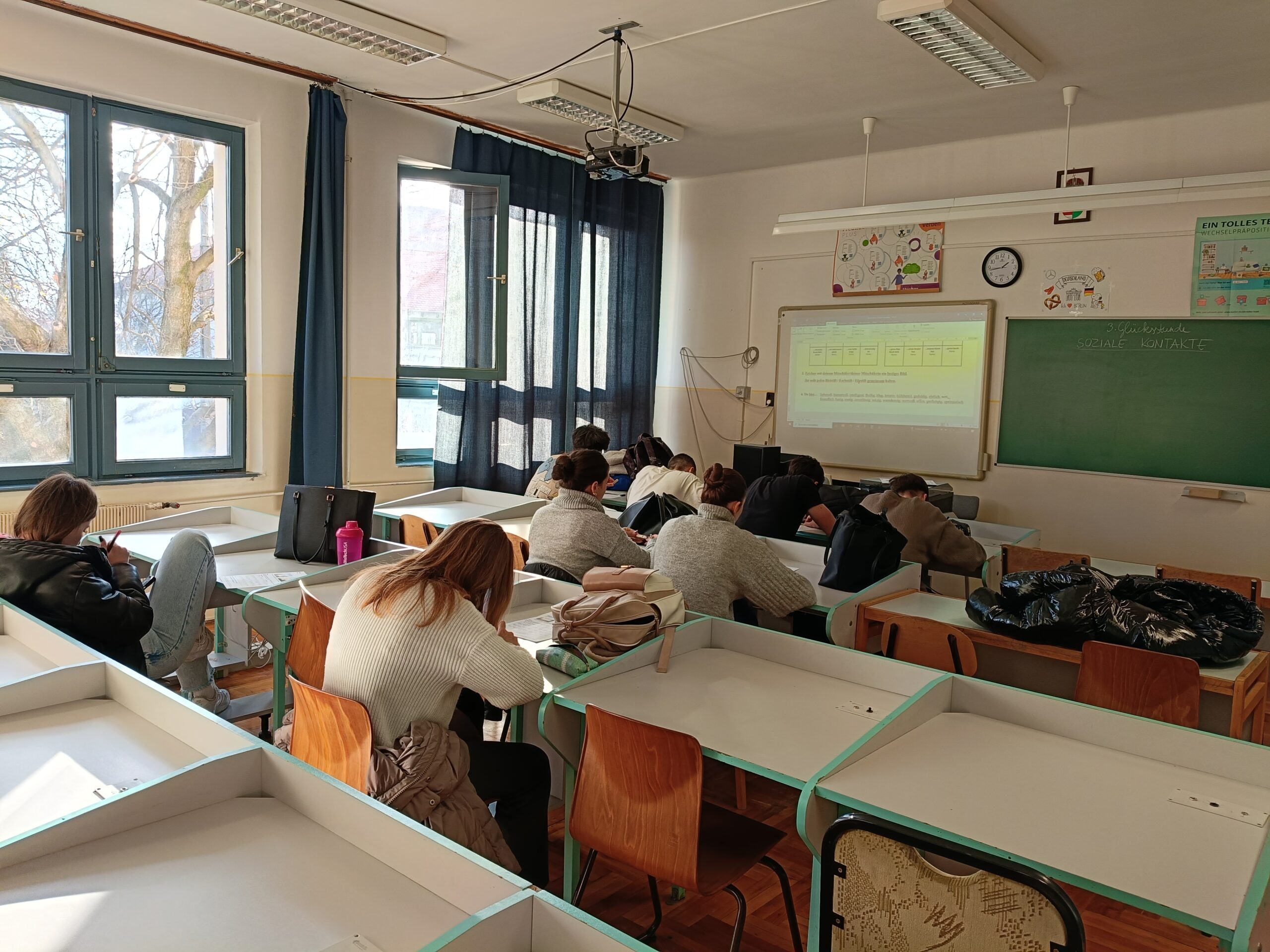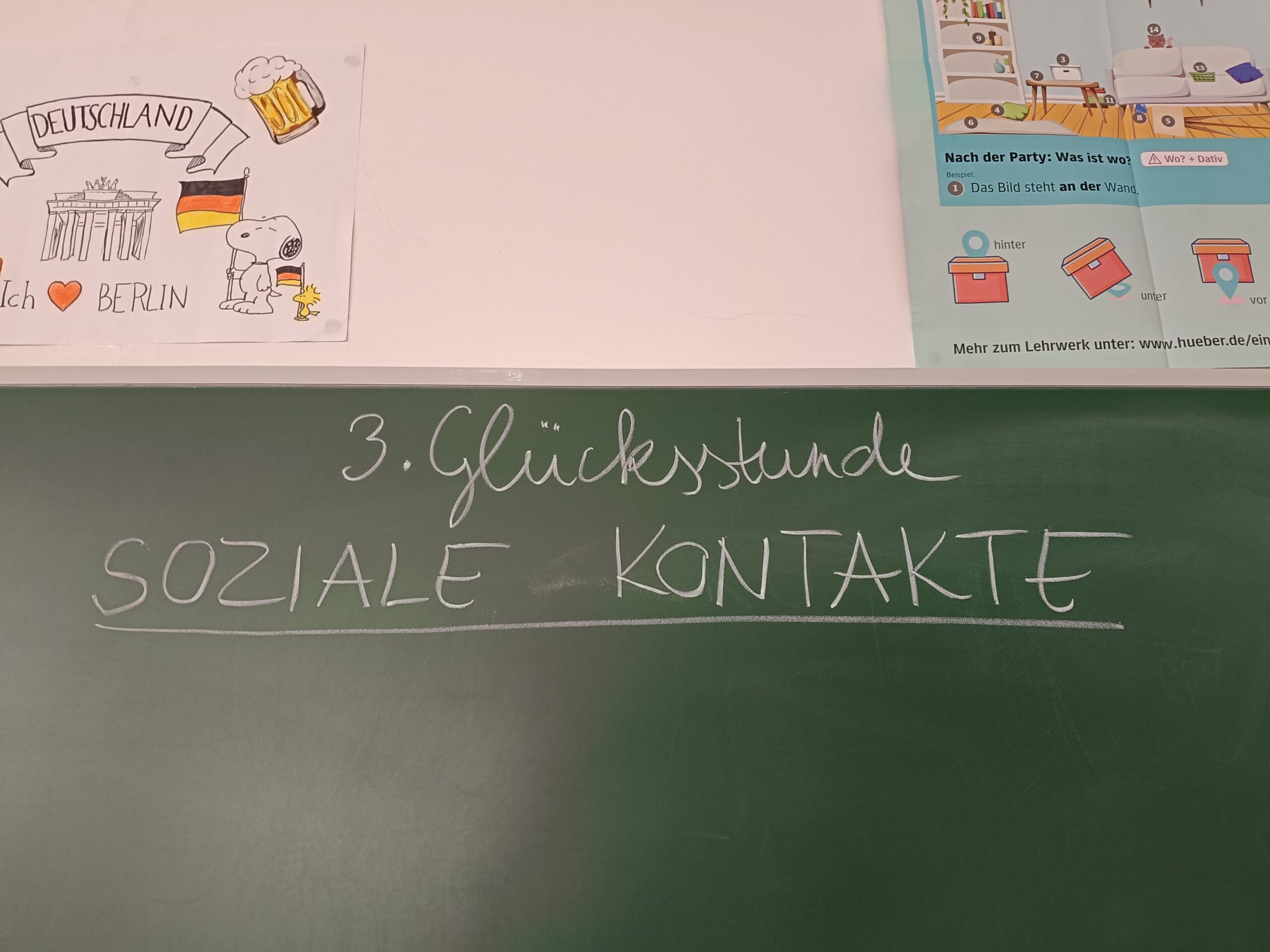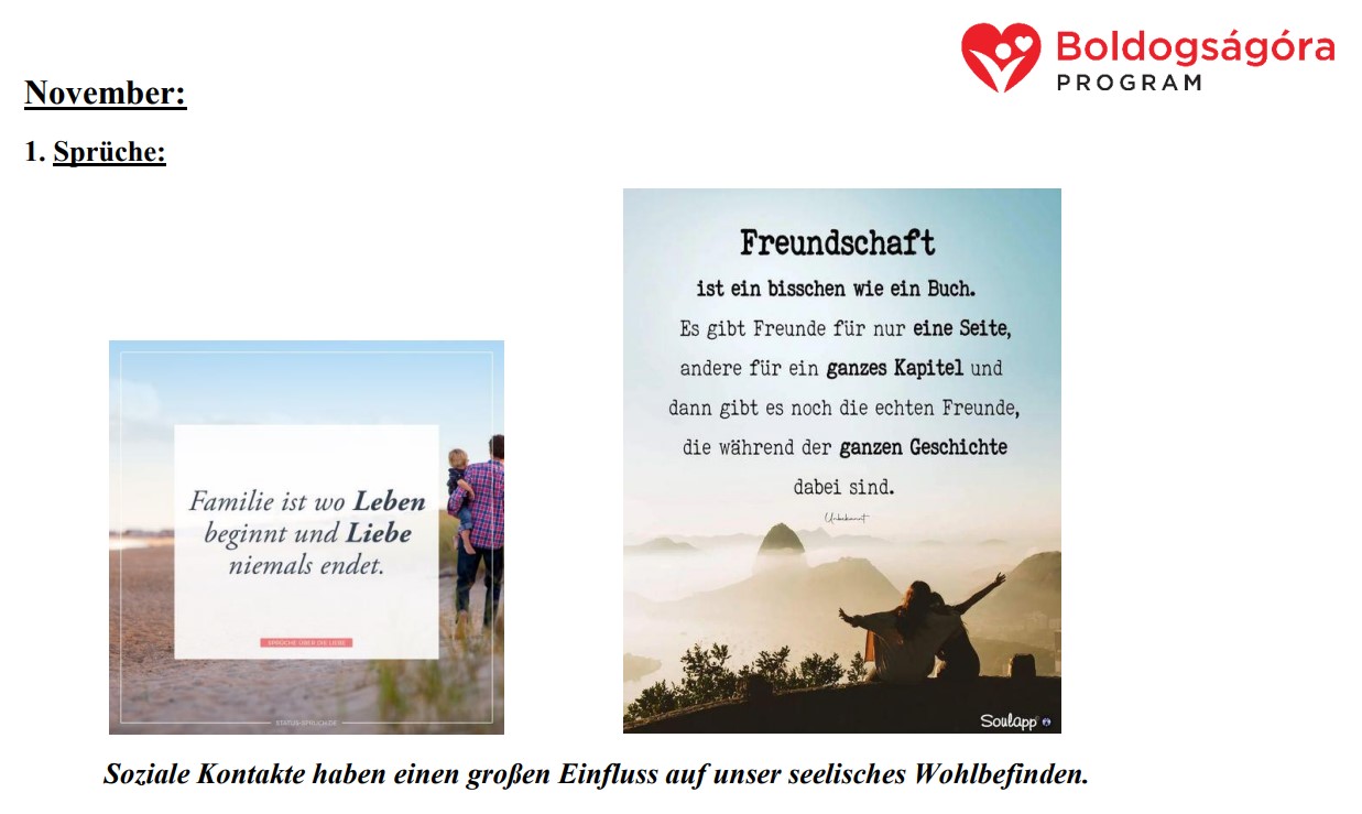 A novemberi boldogságóránk témája a „Társas kapcsolatok ápolása” volt. Az órát most is egy szórejtvénnyel kezdtük, hiszen a tanulóknak ki kellett találniuk három kivetített kép segítségével a hónap témáját németül („Soziale Kontakte”). Egy kis segítséggel sikerült is megfejteniük a rejtvényt.