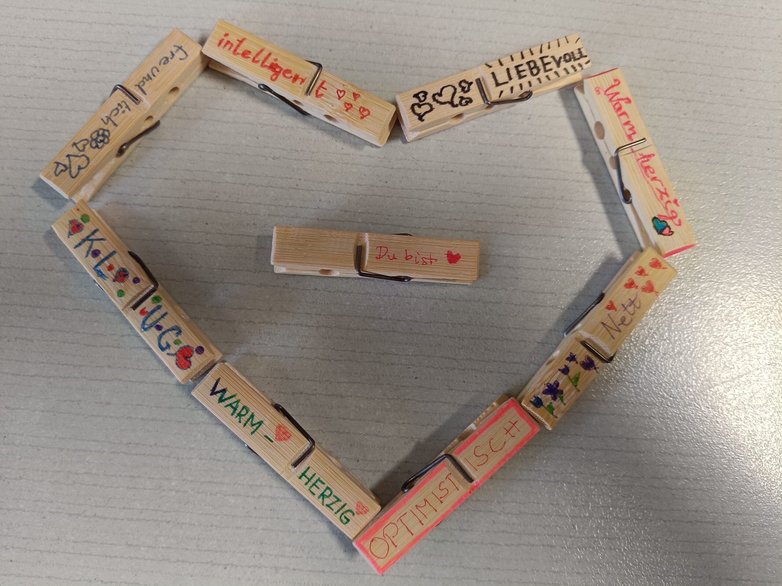 Az órát egy kreatív feladattal zártuk. Mindenki választott a feladatlapról egy pozitív belső tulajdonságot, amit németül ráírt egy csipeszre (pl.: Du bist warmherzig/kreativ/liebevoll…). Azt kértem tőlük, hogy az elkészült csipeszekből alkossanak egy formát. Végül közös megegyezéssel egy szívformát alakítottak ki. A csipeszt óra végén hazavitték, és megbeszéltük, hogy egy olyan számukra kedves személynek ajándékozzák, akire illik a csipeszre felírt tulajdonság.