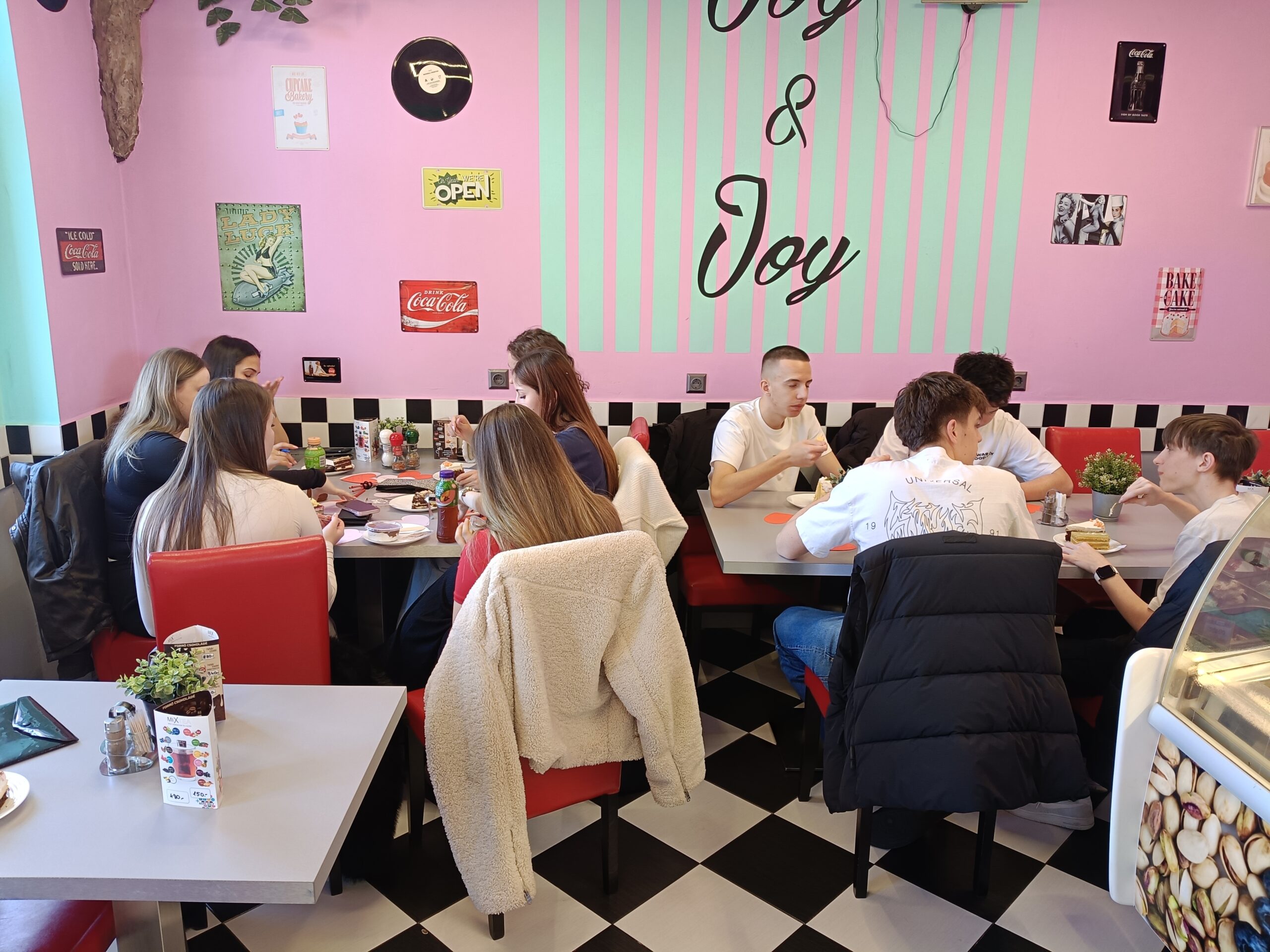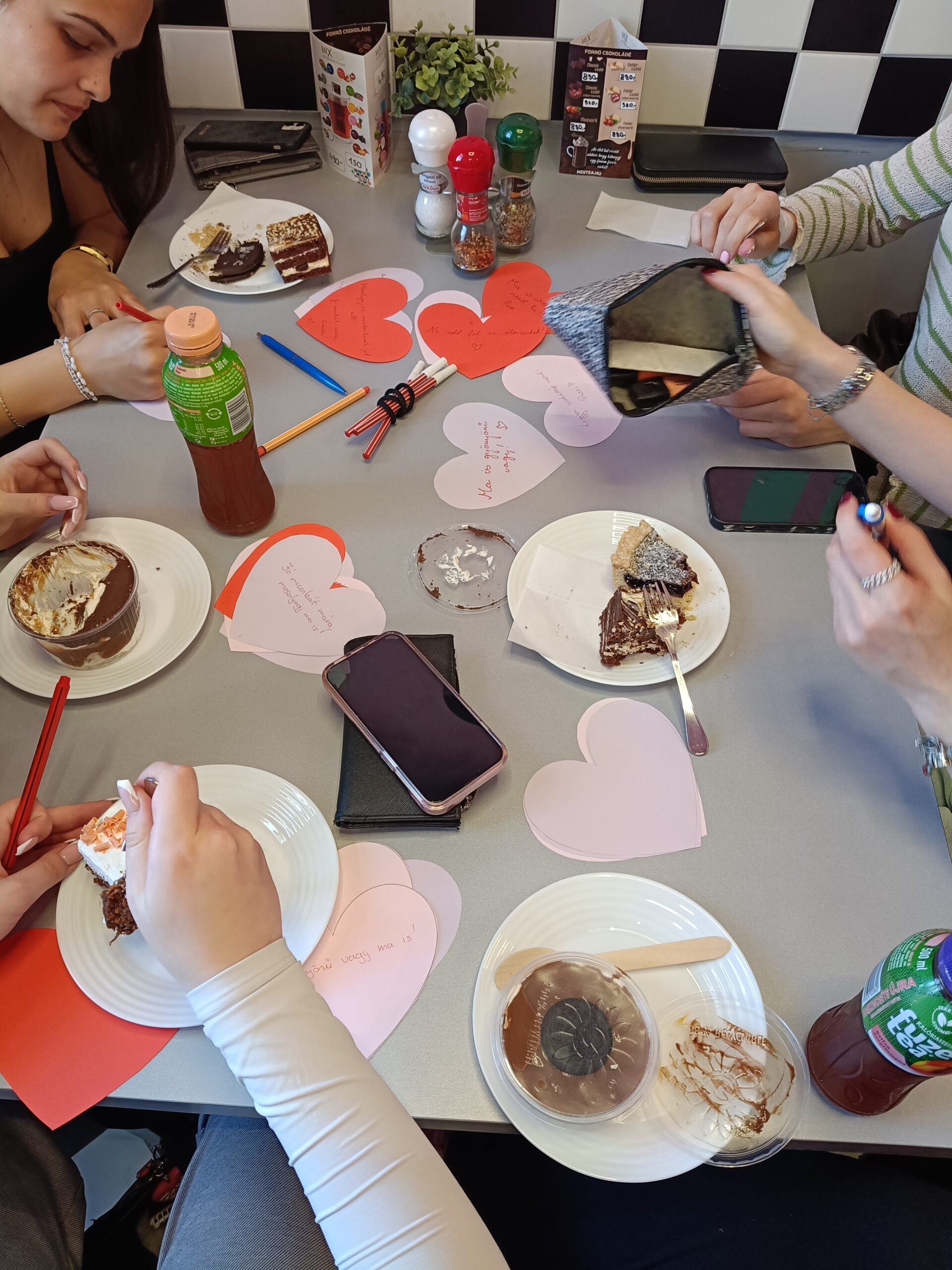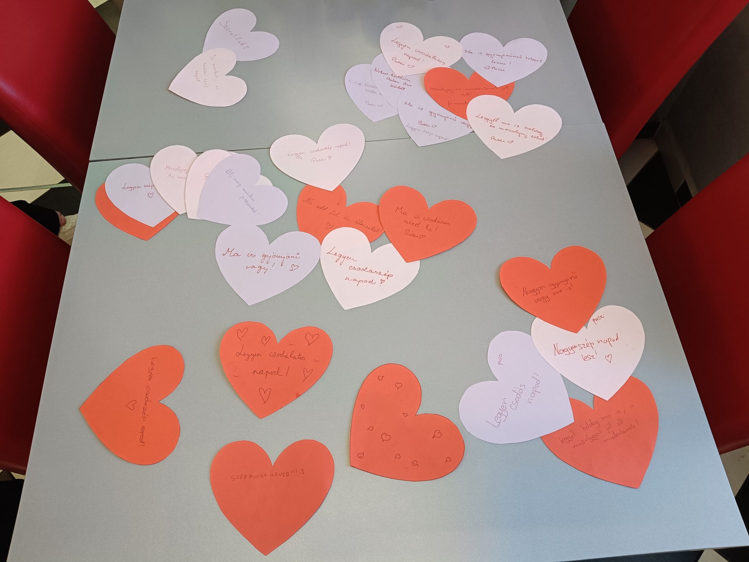 A hetedik boldogságóránkat március 20-án tartottuk a Boldogság Világnapján. A helyszín most kivételesen nem az iskola volt, hanem egy közeli cukrászda. Egy finom süti elfogyasztása mellett a tanulók szívecskékre írtak kedves üzeneteket. Az iskolába visszavezető úton a megírt szívecskéket az utcán és a környékbeli üzletekben szétosztogatták, amivel nagy örömet szereztek az embereknek.