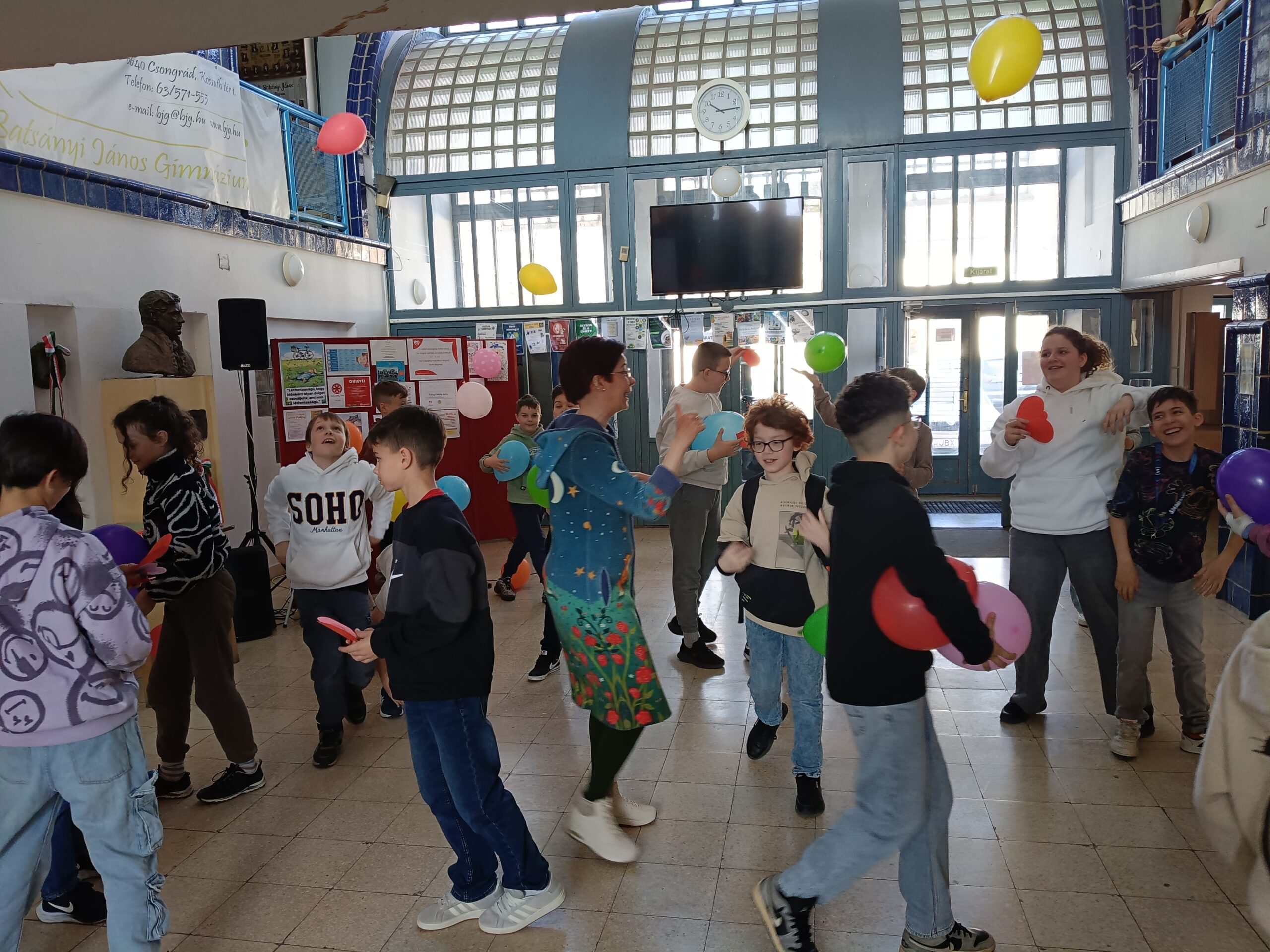 Az iskolában még lufikat is fújtak, amit meglepetésként a gimnáziumunk legkisebb tanulói, az ötödikesek kaptak meg.