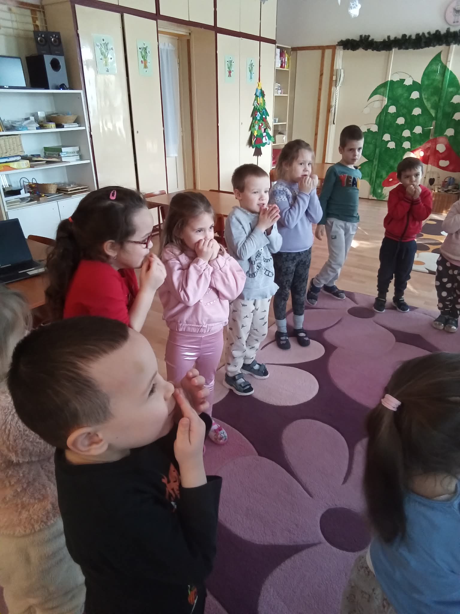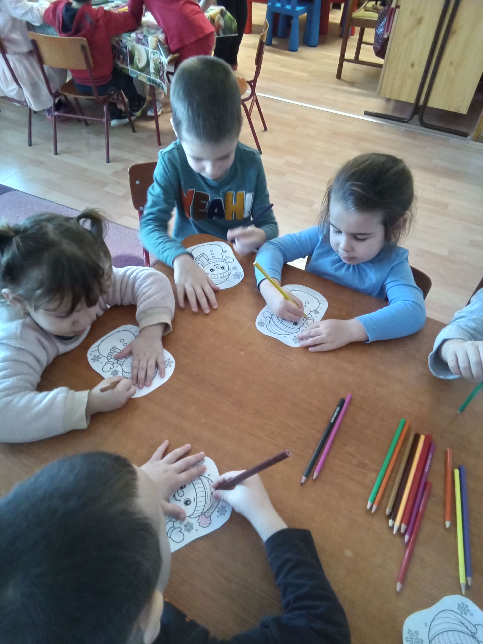 Foglalkozásunk záró részében kiszinezték a mosolygó Hóembereket, és a „Téli célfelhőkbe ” megfogalmazták gondolataikat. Hangulatteremtő céllal téli zeneszámokat hallgattunk . A foglalkozás végén most is elvégeztük az elégedettség mérést , amely szerint most is, mint mindig valamennyien jól érezték/ jól éreztük magukat.:-)