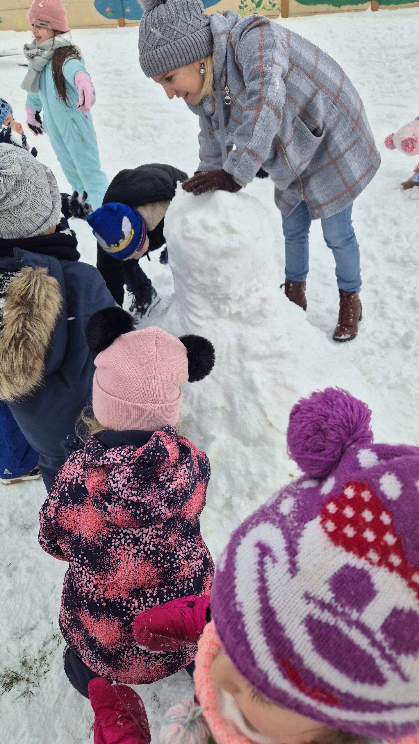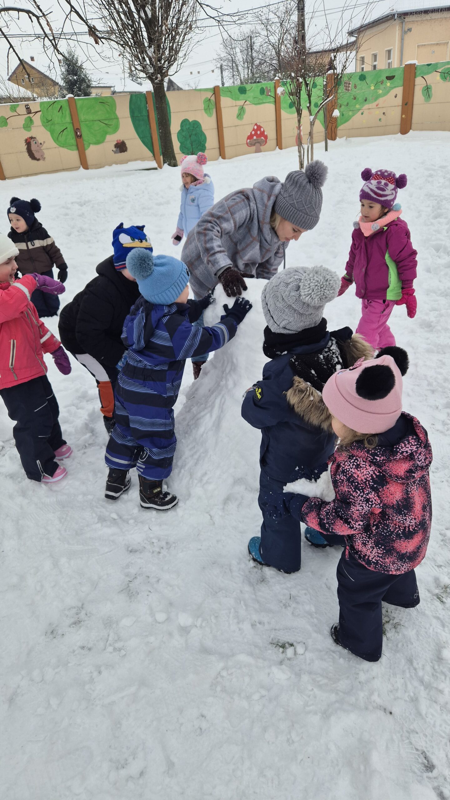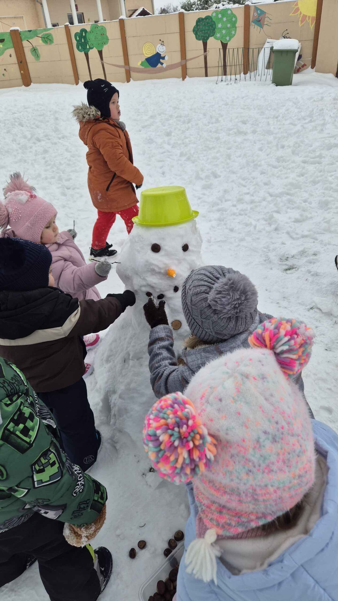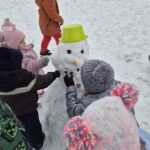 Igazi örömet okozott számunkra a közös hóember készítés is! Vidám gyerekhangok, nevetés, közös éneklés, mondókázás közben el is készült a hóember.