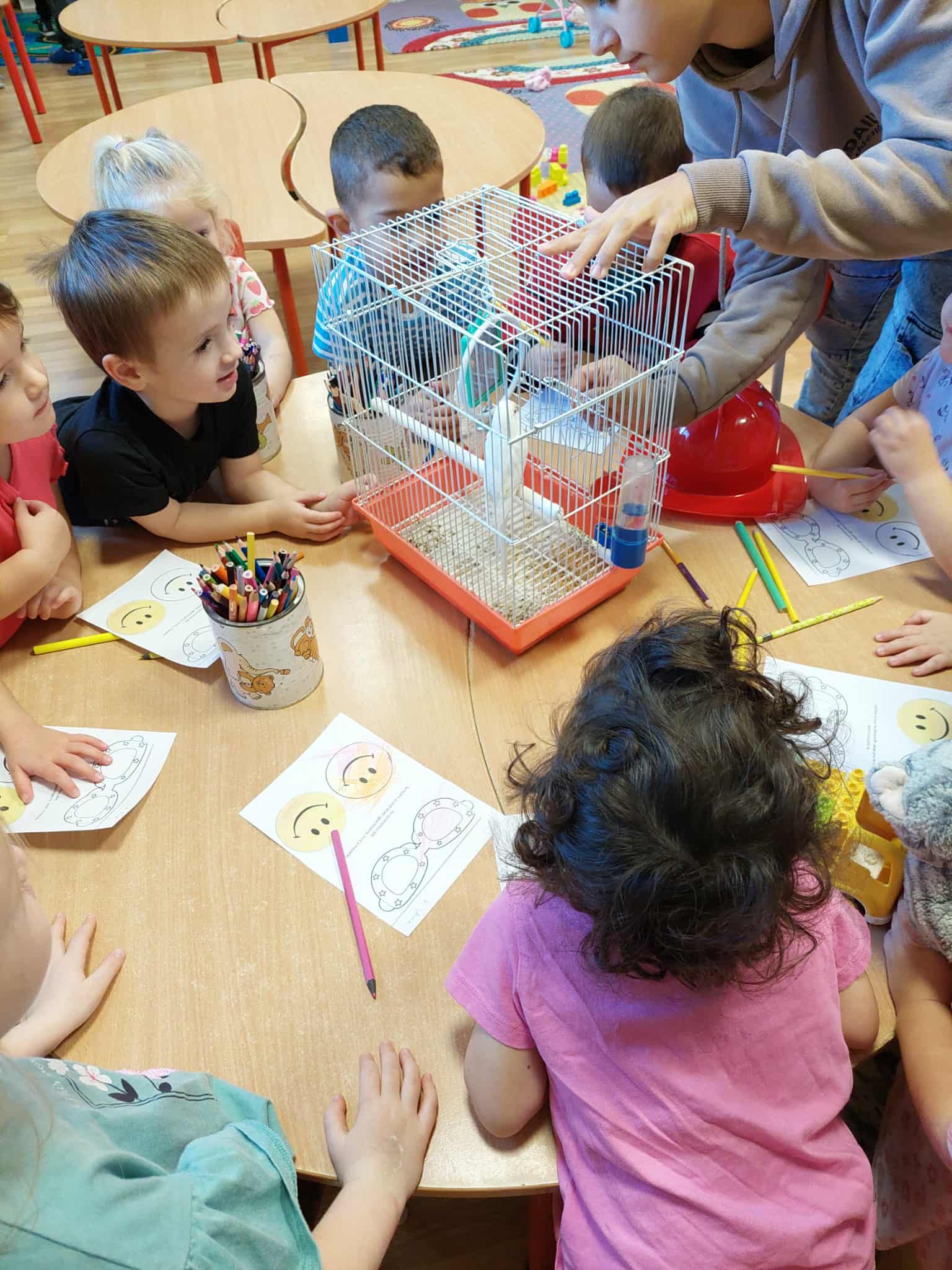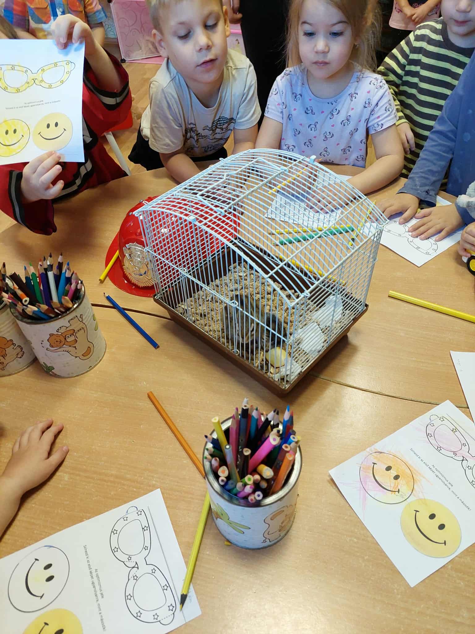 Örömmel játszottam le újra a dalt, amire a mozgásos koreográfiát már több gyermek is ismételte. Nagyon szeretnek táncolni. Még nagyon kicsik és mozgékonyak, szeleburdi kiscsillagok a kiscsoportosaink. Egy kicsit kimelegedtünk és hogy pihenjünk, leültünk a szőnyegre. Ekkor próbáltam a gyermekeket rávezetni arra, hogy milyen is az optimista gyermek. Kinéztünk az ablakon, szépen sütött a nap, a madarakat hallottuk a fákon csicseregni. Ahogy ezt hallgattuk, egyszer csak kopogtak a csoportszoba ajtaján és hoztak be az iskolások két kis állatot, amelyeket csodálattal és örömmel fogadtunk. Nagyon tetszett a gyermekeknek a papagáj és a mókus. Az előző héten az állatokról beszélgettünk. Boldogok voltak a gyerekek, hogy ilyen közelről láthatják és megsimogathatták a kismadarat és a mókust. Nagyon jó volt az idő, ezért ki tudtunk menni az udvari játékokhoz játszani. Szuperül éreztük magunkat! Az ebéd is finom volt és pihenőidőben meséltem el a gyerekeknek a Tódi törpe varázsszemüvege című mesét. Kiszíneztük a varázsszemüveget és az optimizmus jelét is. Egész héten végig vittük a Boldogságórát, így jutott idő másik mesére is. A varázsbonbon mese azért volt érdekes, mert a gyermekeket arra ösztönözte, hogy megkóstolhassák az általam hozott varázsbonbonokat. Tényleg jókedvre derítette a gyermekek többségét és motiválta őket abban, hogy ügyesen összepakoljanak, figyeljenek. A játék, a tánc, a zene, a mozgásos játékok örömforrás számukra.