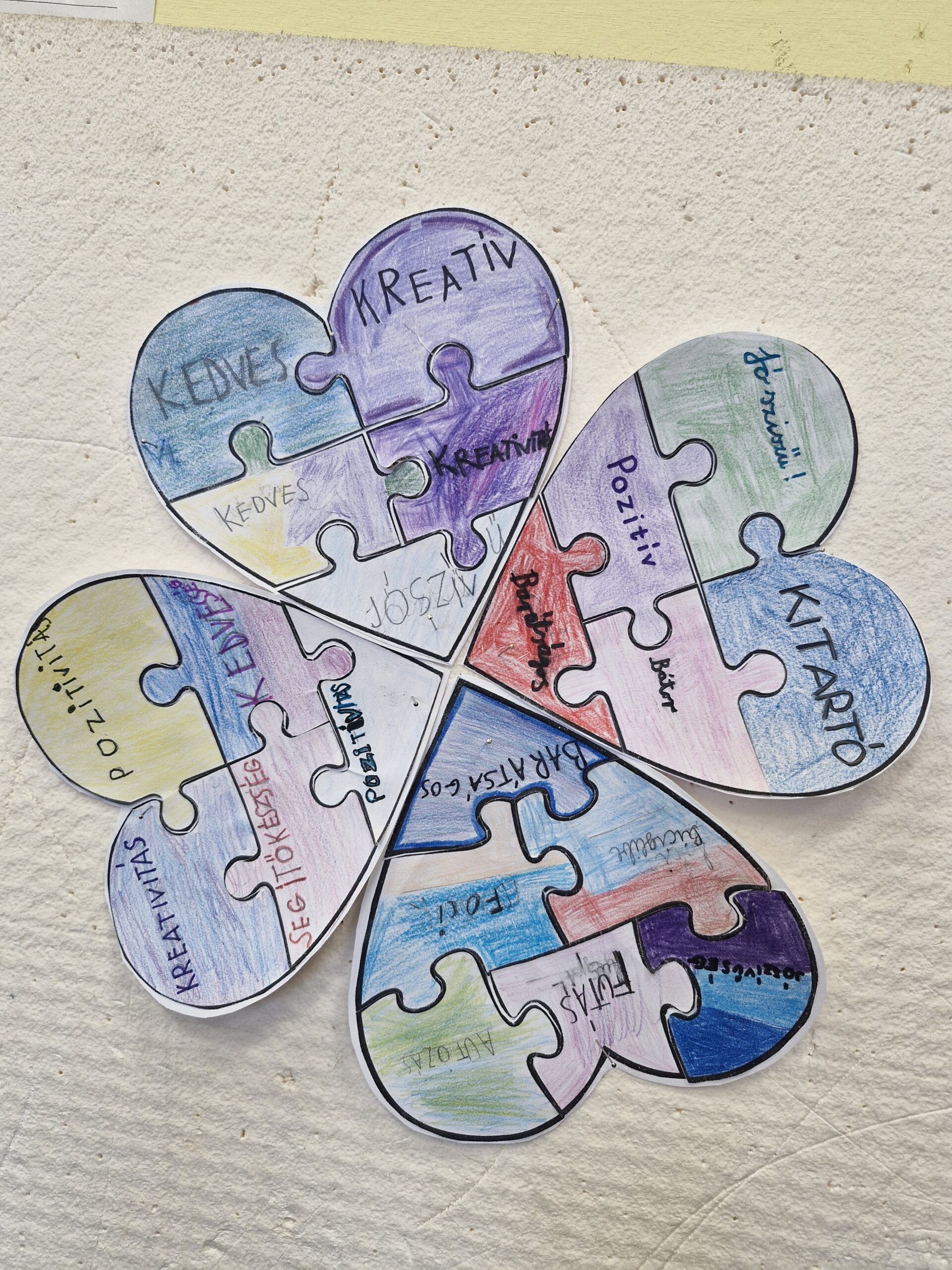 A mese meghallgatása után megbeszéltük, majd közmondásokkal alátámasztottuk, hogy milyen egy jó barát. A szív puzzle kirakásával azt emeltük ki, hogy sokfélék vagyunk, mégis tudunk közös cél érdekében együtt dolgozni.