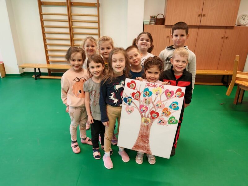 Közösen kiszíneztük a jóságfánkat és felragasztottuk rá a színes szívecskéket, a kiválasztott jócselekedetekkel. A szívecskékre felkerültek azok a jóságok, amelyeket megkerestünk egymásban és magunkban.