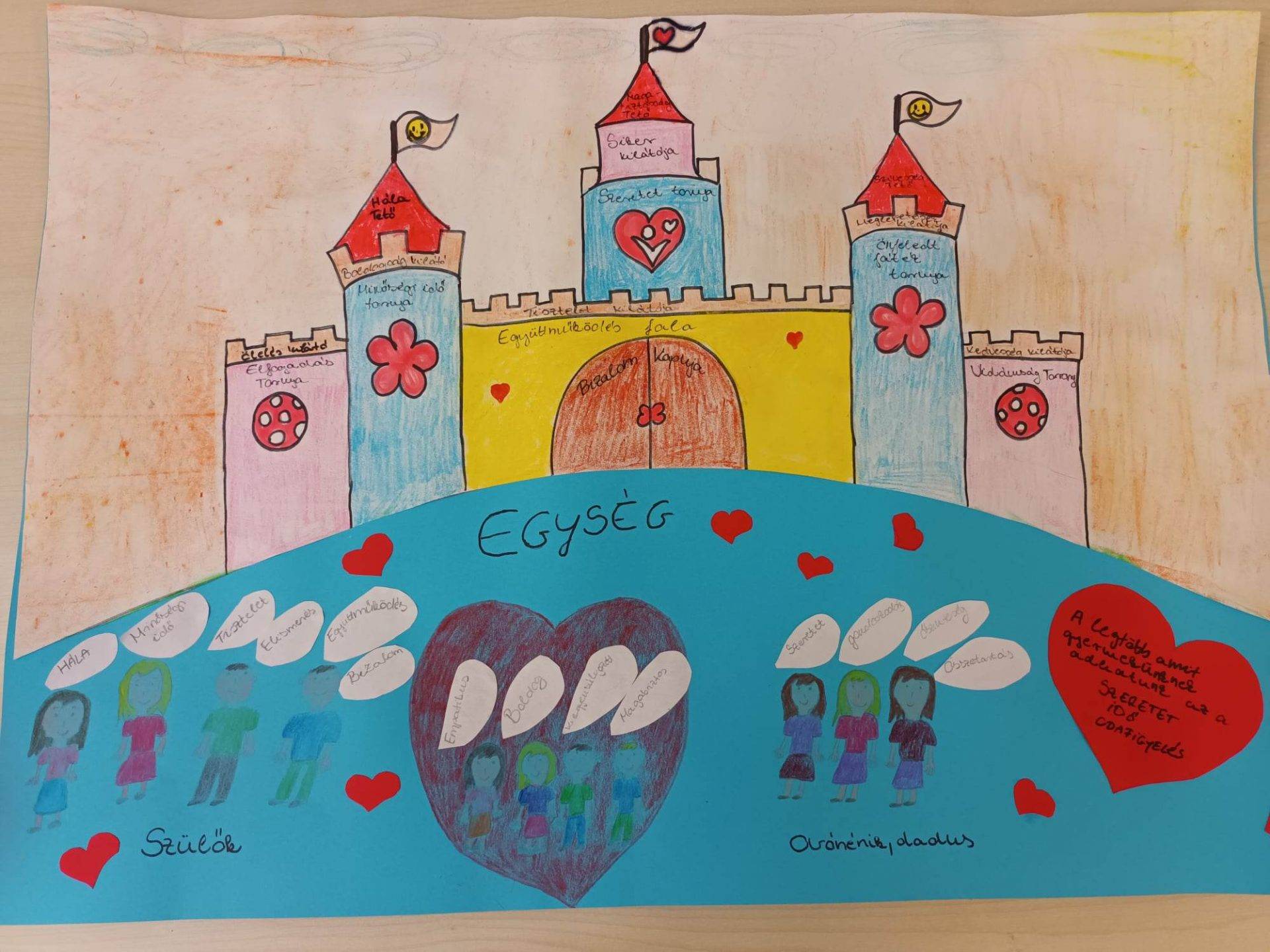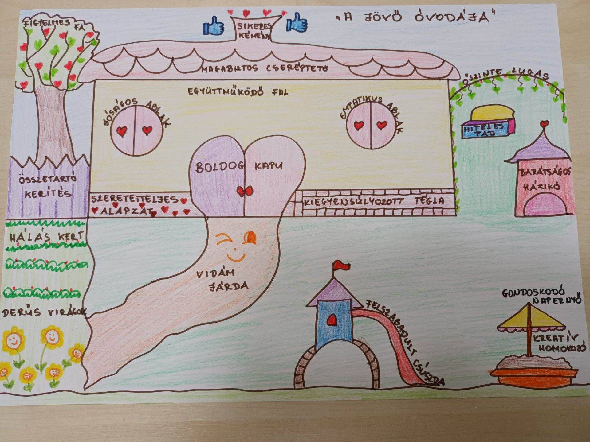 A legmeghatóbb számomra az volt, hogy az egyik aktív és rendkívül érzelem gazdag édesanya is készített csoportunknak egy „Jövő óvodája szülő szemmel” című rajzot, ahol megfogalmazta, ő milyen pozitív tulajdonságokat tart fontosnak a gyermekek, pedagógusok és szülők szemszögéből.