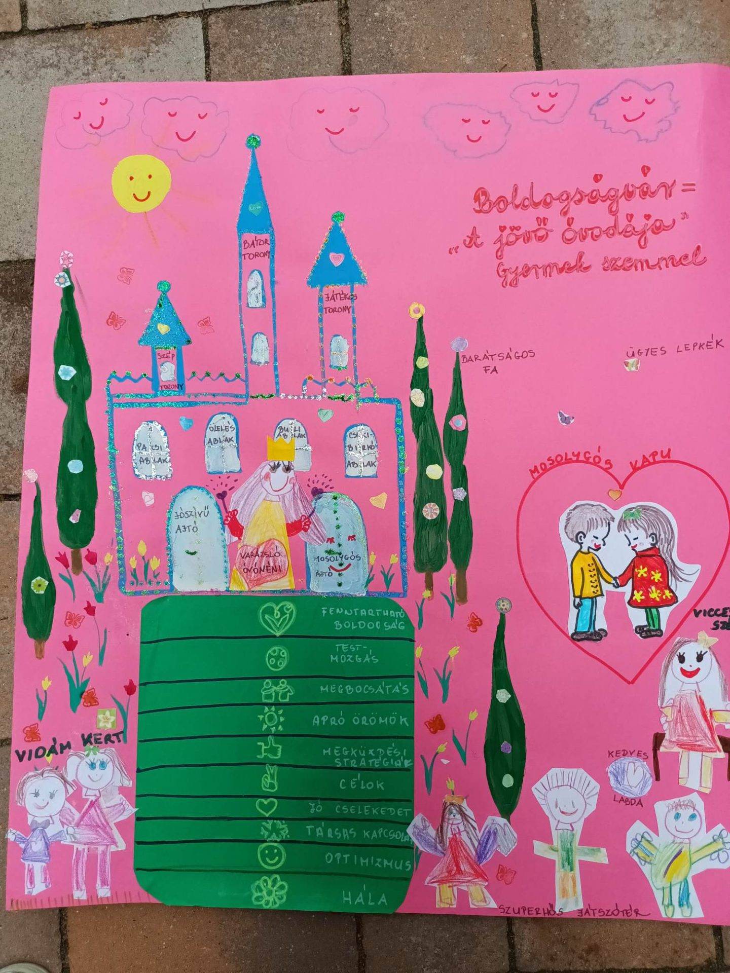 A kreativitásra alapozva, a gyerekekkel közösen megterveztük, majd megalkottuk az „Álom Ovinkat”: az volt a feladat, hogy csukott szemmel képzeljék el, milyen lenne az óvoda, ha tudnánk varázsolni. Ezután közösen elkezdtük megrajzolni, díszíteni. Örömmel tapasztaltam, hogy a Boldogságvárhoz hasonló óvodát képzeltek el, mely azt tükrözi, hogy a program megérinti lelküket.