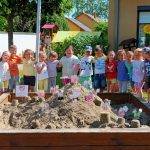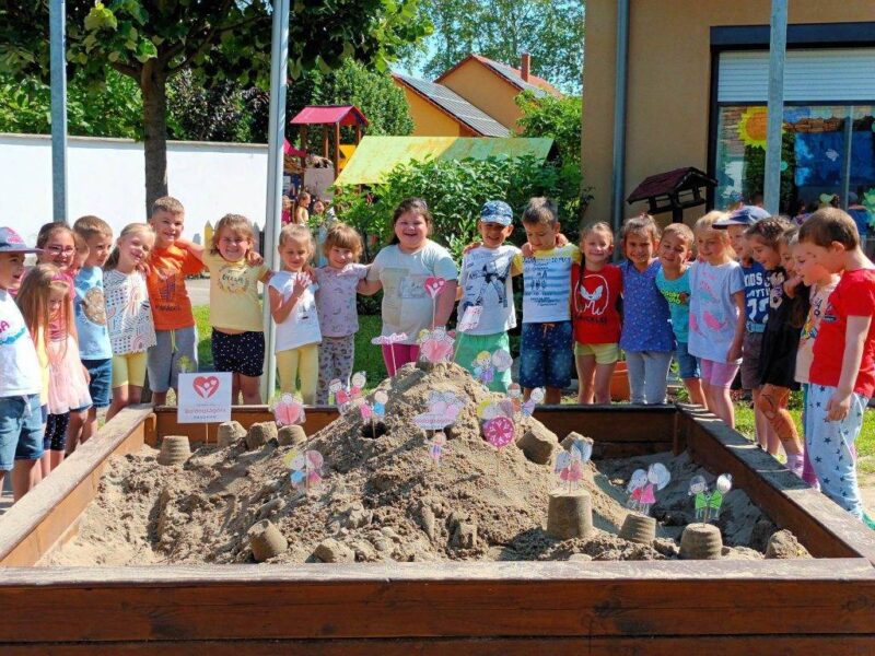 Az udvaron megépítettük a Boldogságvárat homokból, majd körbejártuk a Jobb veled a világ című dalra.