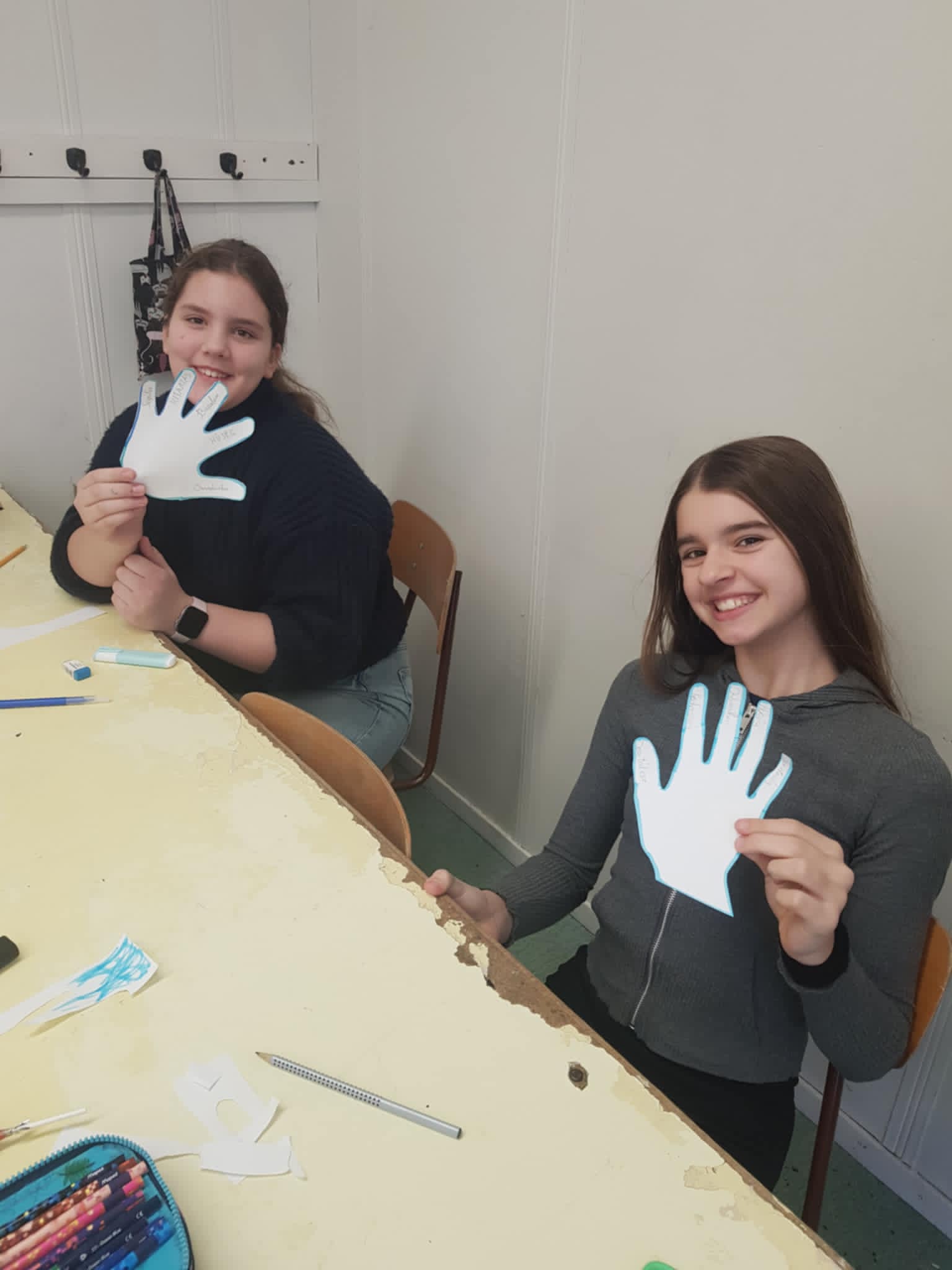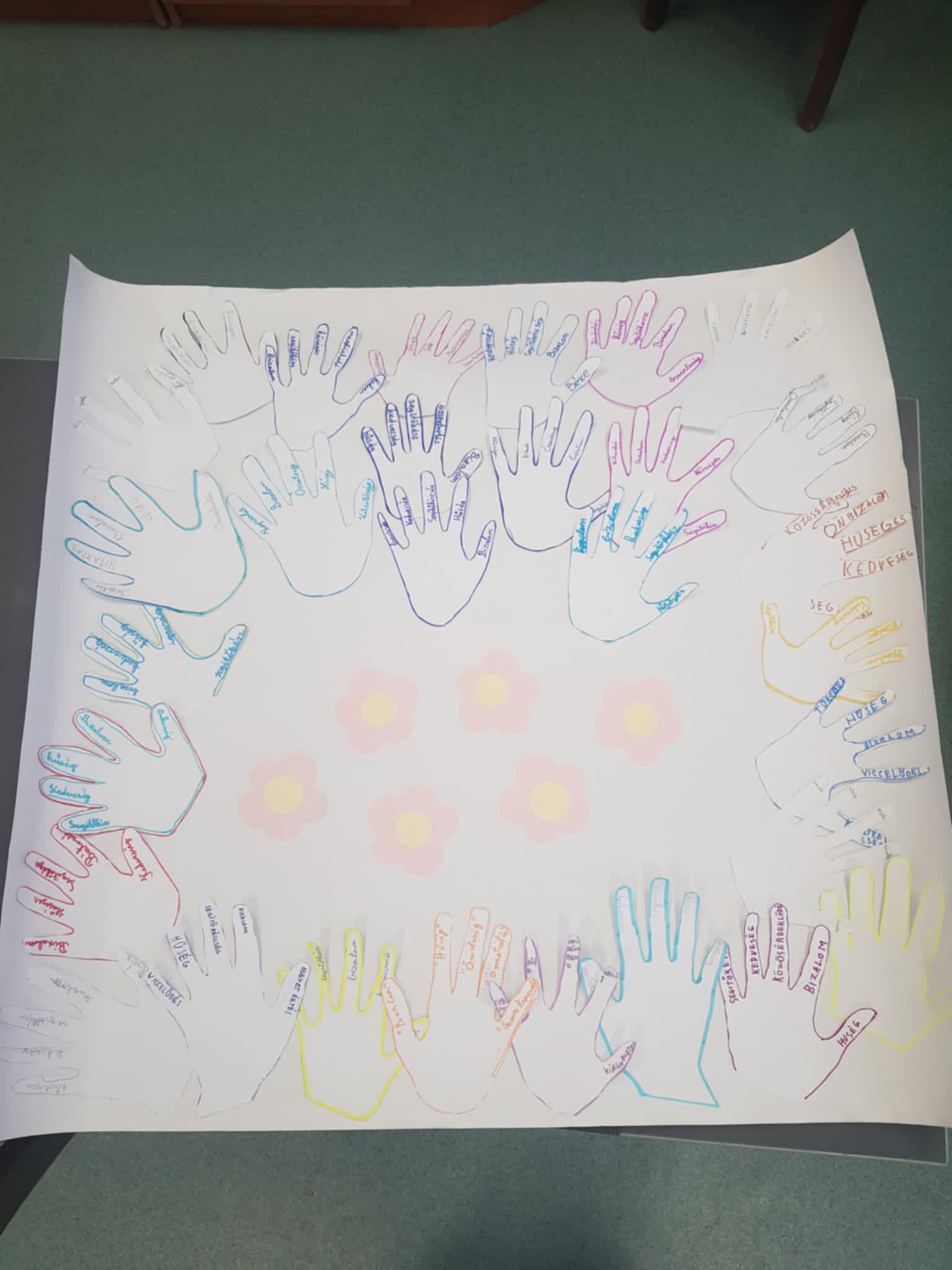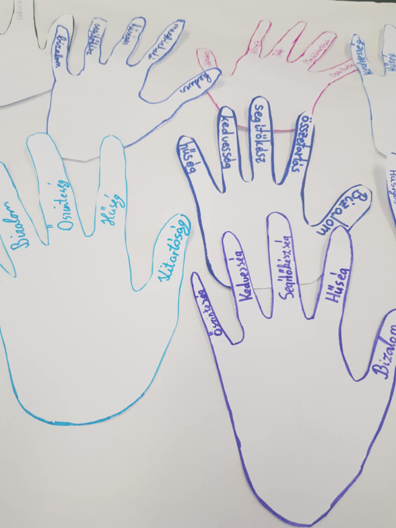 A kapcsolatok ápolása témától kicsit tartottam, mivel a kényesebb témák közé tartozik. Az oztályom nagyon együttműködő volt. Nehézséget jelentett az egyik feladatnál, hogy a fogalmakat nehezen tudták összegyűjteni, hogy melyek a legfontosabbak egy barátságban, ehhez kis segítségre volt szükségük. Nagyon örültek, amikor mindenki kézfejét (az ujjakban a fogalmakkal) felragasztottam egy plakátra, majd közösen elhelyeztük az osztályunk egy központi helyére. Boldogan fotózkodtak alatta, jó kis nap volt együtt.