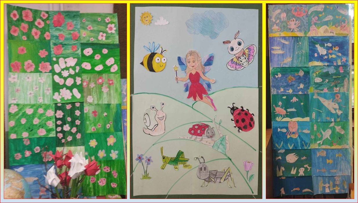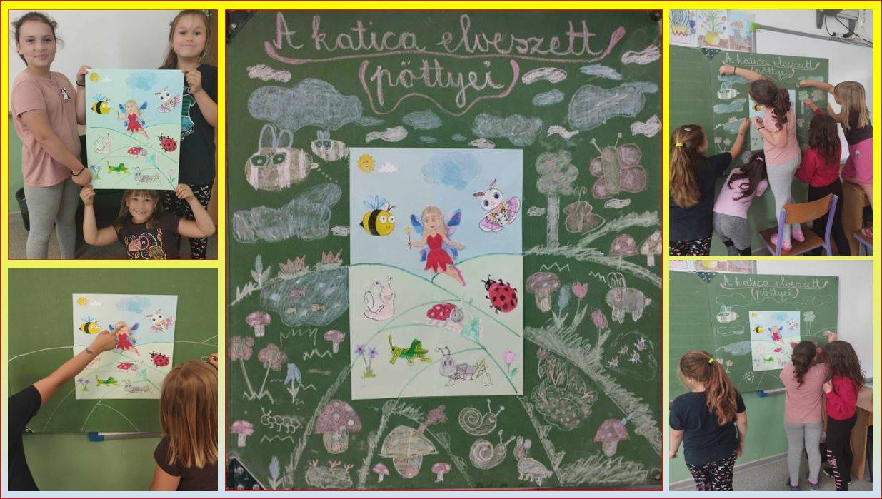 Fő feladatként „A katica elveszett pöttyei” című mesét olvastuk el, dolgoztuk fel folyamatosan. Boldogan számolták hangosan, együtt nagykatica egyre fogyó pöttyeit, majd a segédanyagokban található sablonok alapján kiszíneztük, kivágtuk a szereplőket és egy mezei háttérképre ragasztottuk fel őket. A mese olyan sikert aratott, hogy a gyerekek a táblára ragasztott mezei képet krétarajzzal is kiegészítették, bővítették. Sokat beszélgettünk a szereplők tulajdonságairól, nagykatica önzéséről, büszkeségéről, kiskatica barátságosságáról, segítőkészségéről, alázatáról, a többiek együttműködéséről, a szeretetről, a bocsánatkérésről és a megbocsátás fontosságáról. Megállapítottuk, hogy „minden jó, ha jó a vége”, hiszen a mese végére a közös játéknak és a megbékélésnek jutott a főszerep. Mivel a mese helyszíne a rét, ezért készítettünk egy pipacsmezőt ábrázoló alkotást is. Mindenki a zöld szín árnyalataival festette le a rajzlapját, majd amíg megszáradt a festék, egy másik lapra piros pipacsokat rajzoltak/színeztek, amit kivágtak és a zöld lapra ragasztottak. Az egyéni művekből egy nagy közös pipacsmező lett a faliújságon, ami arra emlékeztet minket, hogy „egységben az erő” és „sok kicsi sokra megy”, ha közösen teszünk érte. Ugyanezzel a módszerrel egy tengeri, vízi világot is készítettünk a kék árnyalataival és vízi élőlényekkel, utalva a közelgő nyári szünet strandolási lehetőségeire.