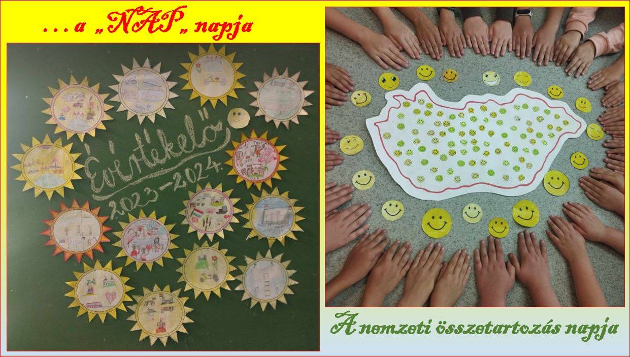 A jeles napok közül június 4-re, a „Nemzeti összetartozás napja” alkalmából készítettünk közösen egy plakátot: Magyarország körvonalrajzán belüli felületre pici, mosolygó „szmájlikat”, kívülre nagyobbakat ragasztottunk, ezzel szimbolizáltuk a határunkon innen/túl élőkkel való összefogást, együttérzést.